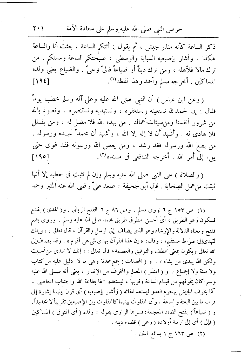 (¬1) ص 153 ج 6 نووي مسلم. ص 86 ج 6 الفتح الرباني. و (الهدي) بفتح فسكون وهو الطريق، أي أحسن الطريق محمد صلى الله عليه وسلم. وروي بضم ففتح ومعناه الدلالة والإرشاد وهو الذي يضاف إلى الرسل والقرآن، قال تعالى: (وإنك لنهدي إلى صراط مستقيم). وقال (إن هذا القرآن يهدى للتي هي أقوم). وقد يضاف إلى الله تعالى ويكون بمعنى اللطف والتوفيق والعصمة، قال تعالى (إنك لا تهدي من أحببت ولكن الله يهدى من يشاء). و (المحدثات) جمع محدثة وهي ما لا دليل عليه من كتاب ولا سنة ولا إجماع. و (المنذر) المعلم والمخوف من الإنذار، معني أنه صلى الله عليه وسلم كان يخوفهم من قيام الساعة وقربها، ليستعدوا لها بطاعة الله واجتناب المعاصي، كما يخوف الجيش بهجوم العدو ليستعد للقائه (وأشار بإصبعيه) أي قرب بينهما إشارة إلى قرب ما بين البعثة والساعة، وأن التفاوت بينهما كالتفاوت بين الإصبعين تقريباً لا تحديداً. و (ضياعاً) بفتح الضاد المعجمة: فسرها الراوى بقوله: ولده (أي المتوفى) المساكين (فإلى) أي إلى تربية أولاده (وعلى) قضاء دينه.