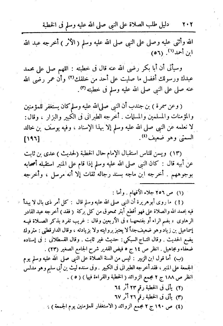 (ب) ... أما قول ابن الزبير: ليس من سنة الصلاة على النبى صلى الله عليه وسلم يوم الجمعة على المنبر، فقد أخرجه الطبرانى فى الكبير وفى سنده ليث بن أبى سليم وهو مدلس انظر ص 188 ج 2 مجمع الزوائد (الخطبة والقراءة فيها) (5).