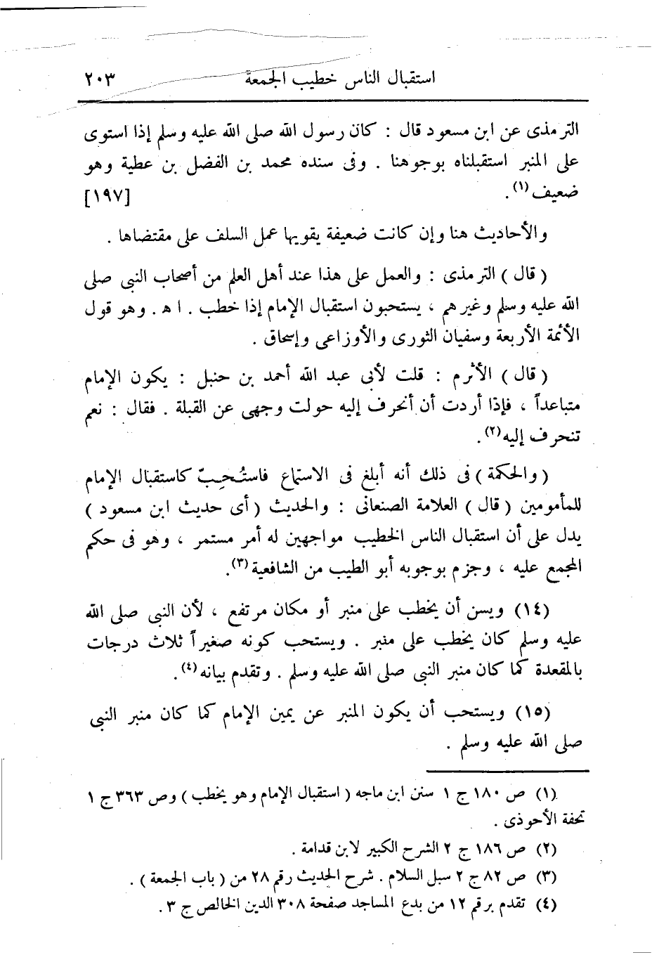 الترمذى عن ابن مسعود قال: كان رسول الله صلى اله عليه وسلم إذا استوى على المنبر استقبلناه بوجوهنا. وفى سنده محمد ابن الفضل بن عطية وهو ضعيف (¬1). [197].