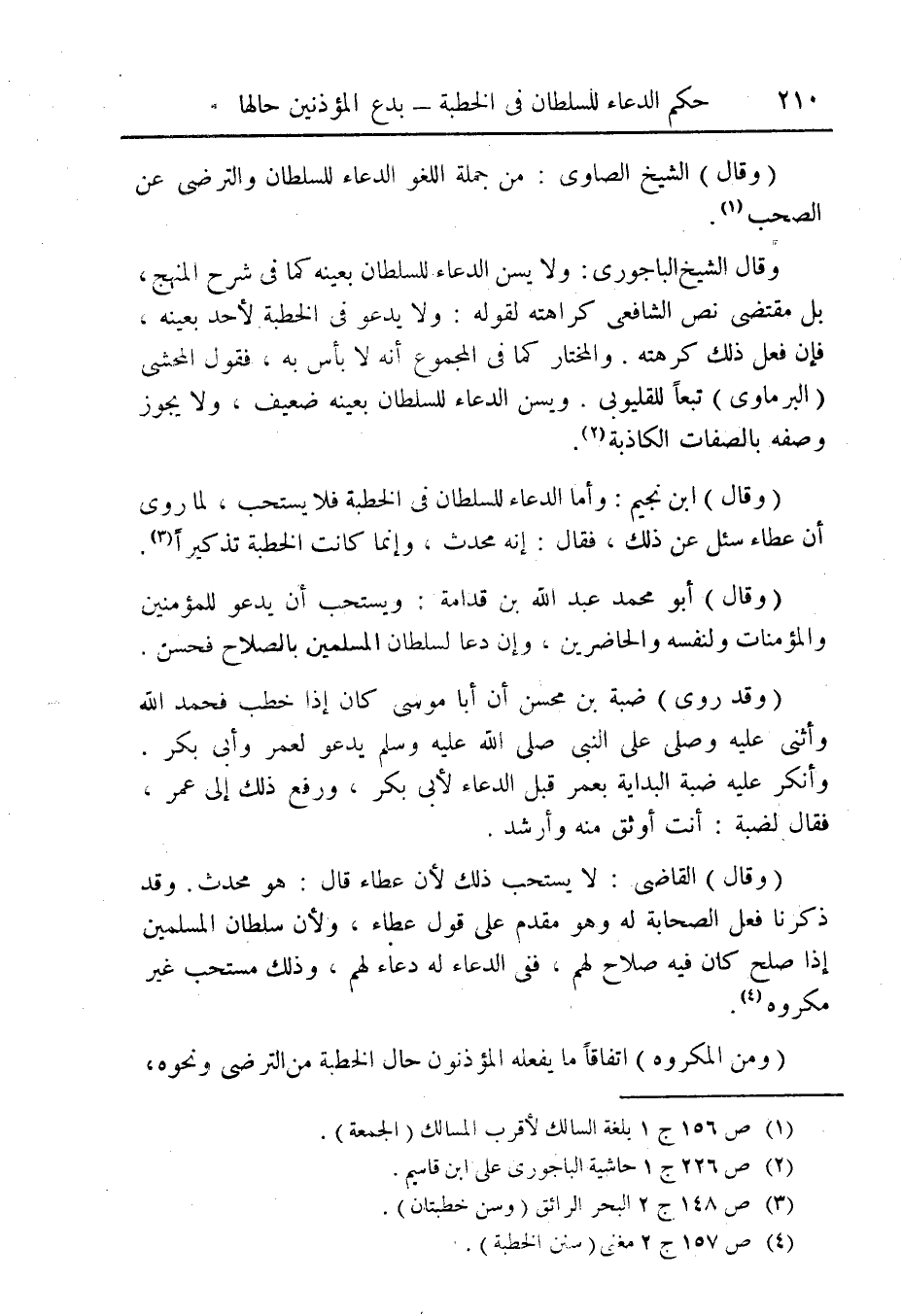 وقال الشيخ الباجورى: ولا يسن الدعاء للسلطان بعينه كما فى شرح المنهج، بل مقتضى نالشافعى كراهته لقوله: ولا يدعو فى الخطبة لأحد بعينه، فإن فعل ذلك كرهته. والمختار كما فى المجموع أنه لابأس به، فقول المحشى (البرماوى) تبعاً للقليوبى. ويسن الدعاء للسلطان بعينه ضعيف، ولا يجوز وصفه بالصفات الكاذبة (¬2).