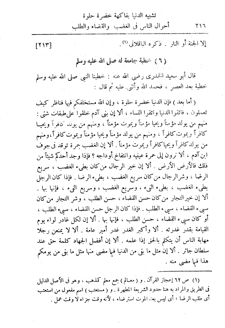 (أما بعد) فإن الدنيا خضرة حلوة، وإن الله مستخلفكم فيها فناظر كيف تعملون، فاتقوا الدنيا واتقوا النساء، ألا إن بنى آدم خلقوا على طبقات شتى: منهم من يولد مؤمناً ويحيا مؤمناً ويموت مؤمناً، ومنهم من يولد كافراً ويحيا كافراً ويموت كافراً، ومنهم من يولد مؤمناً ويحيا مؤمناً ويموت كافراً، ومنهم من يولد كافراً ويحيا كافراً ويموت مؤمناً. الا إن الغضب جمرة توقد فى جوف ابن آدم، ألا ترون إلى حمرة عينيه وانتفاخ أوداجه؟ فإذا وجد أحدكم شيئاً من ذلك فالأرض الأرض. إلا عن خير الرجال من كان بطئ الغضب، سريع الرضا، وشر الرجال من كان سريع الغضب، بطئ الرضا. فإذا كان الرجل بطئ الغضب، بطئ الفئ، وسريع الغضب، وسريع الفئ، فإنها بها.