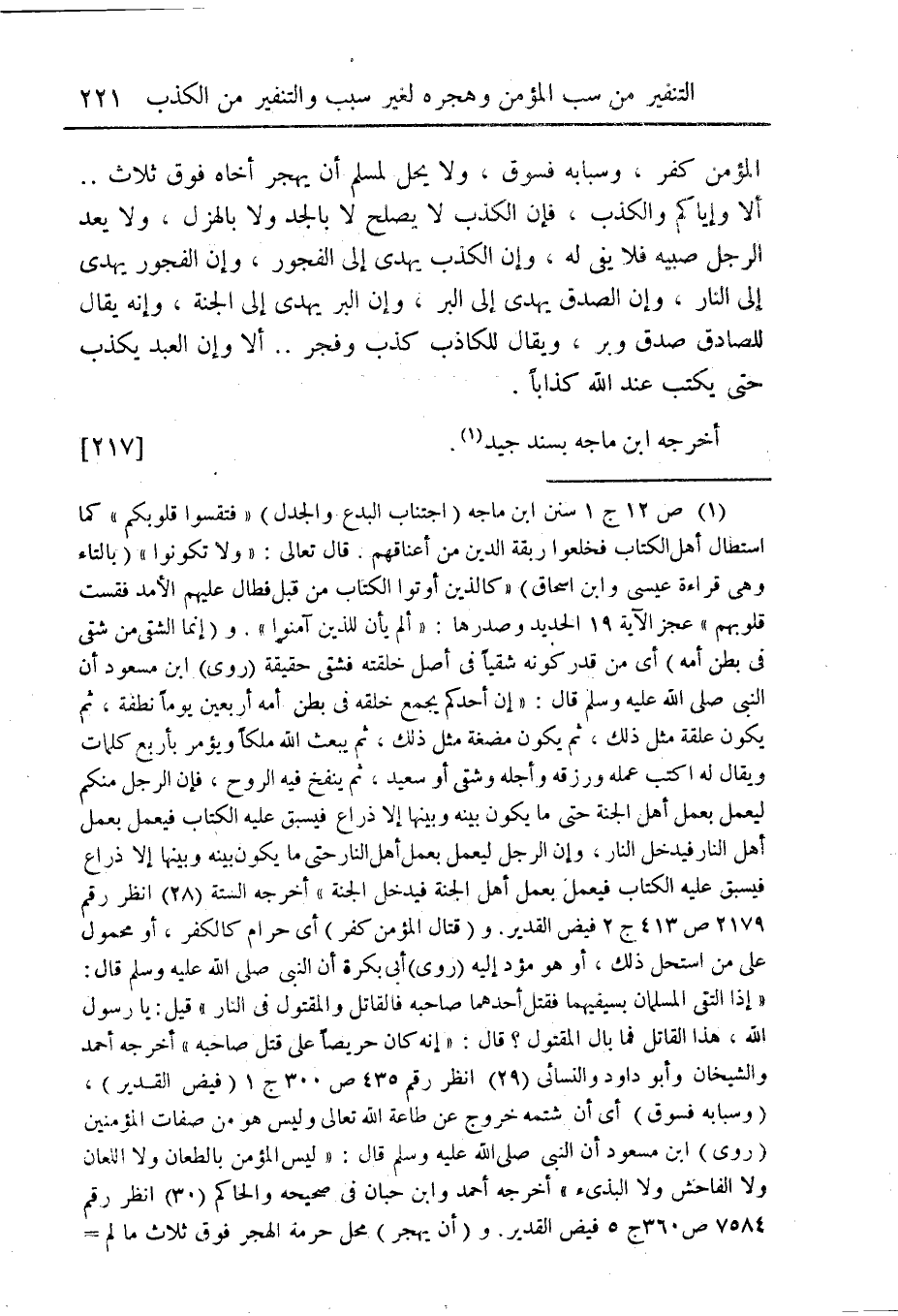 (¬1) ص 12 ج 1 سننابن ماجه (اجتناب البدع والجدل) ط فقسوا قلوبكم " كما استطال اهل الكتاب فخلعوا ربقة الدين منأعناقهم. قال تعالى: " ولا توكونوا" (بالتاء وهى قراءة عيسى وابن اسحاق) " كالذين أوتوا الكتاب من قبل فطال عليهم الأمد فقست قلوبهم " عجز الاية 19 الحديد وصدرها: " ألم يأن للذين آمنوا". و (إنما الشقى من شقى فى بطن أمه) أى من قدر كونه شقياً فى أصل خلقته فشقى حيقية (روى) ابن مسعود أن النبى صلى الله عليهوسلم قال: "إن أحدكم يجمع خلقه فى بطن أمه أربعين يوماً نطفة، ثم يكون علقة مثل ذلك، ثم يكون مضعفة مثل ذلك، ثم يبعث الله ملكاً ويؤمر بأربع كلمات ويقال له اكتب عمله ورزقه وأجله وشقى أو سعيد، ثم ينفخ فيه الروح، فإن الرجل منكم ليعمل بعمل أهل الجنة حتى ما يكون بينه وبينها إلا ذراع فيسبق عليه الكتاب فيعمل بعمل أهل النار فيدخل الجنة " أخرجه الستة (28) انظر رقم 2179 ص 413 ج 2 فيض القدير. و (قتال المؤمن كفر) اى حرام كالكفر، أو محمول على من استحل ذلك، أو هو مؤد إليه (روى) أبى بكرة أنالنبى صلى الله عليه وسلم قال: "إذا التقى المسلمان بسيفيهما فقتل احدهما صاحبه فالقاتل والمقتول فىالنار " قيل: يا رسول الله، هذا القاتل فما بال المقتول؟ قال: " إنه كان حريصاً على قتل صاحبه " أخرجه أحمد والشيخان وأبو داود والنسائى (29) انظر رقم 435 ص 300 ج 1 (فيض القدير)، (وسبابه فسوق) أى أن شتمه خروج عن طاعة الله تعالى وليس هو من صفات المؤمنين (روى) ابن مسعود أنالنبى صلى الله عليهوسلم قال: " ليس المؤمن بالطعان ولا اللعان ولا الفاحش ولا البذئ "أخرجه أحمد وابن حبان فى صحيحه والحاكم (30) انظر رقم 7584 ص 360 ج 5 فيض القدير. و (أن يهجر) محل حرمة الهجر فوق ثلاث ما لم. يكن هجره لله تعالى وإلا فلا، والدليل عليه قصة الثلاثة الذين تخلفوا عن غزوة تبوك، وقد نظم هذا بعضهم فقال: