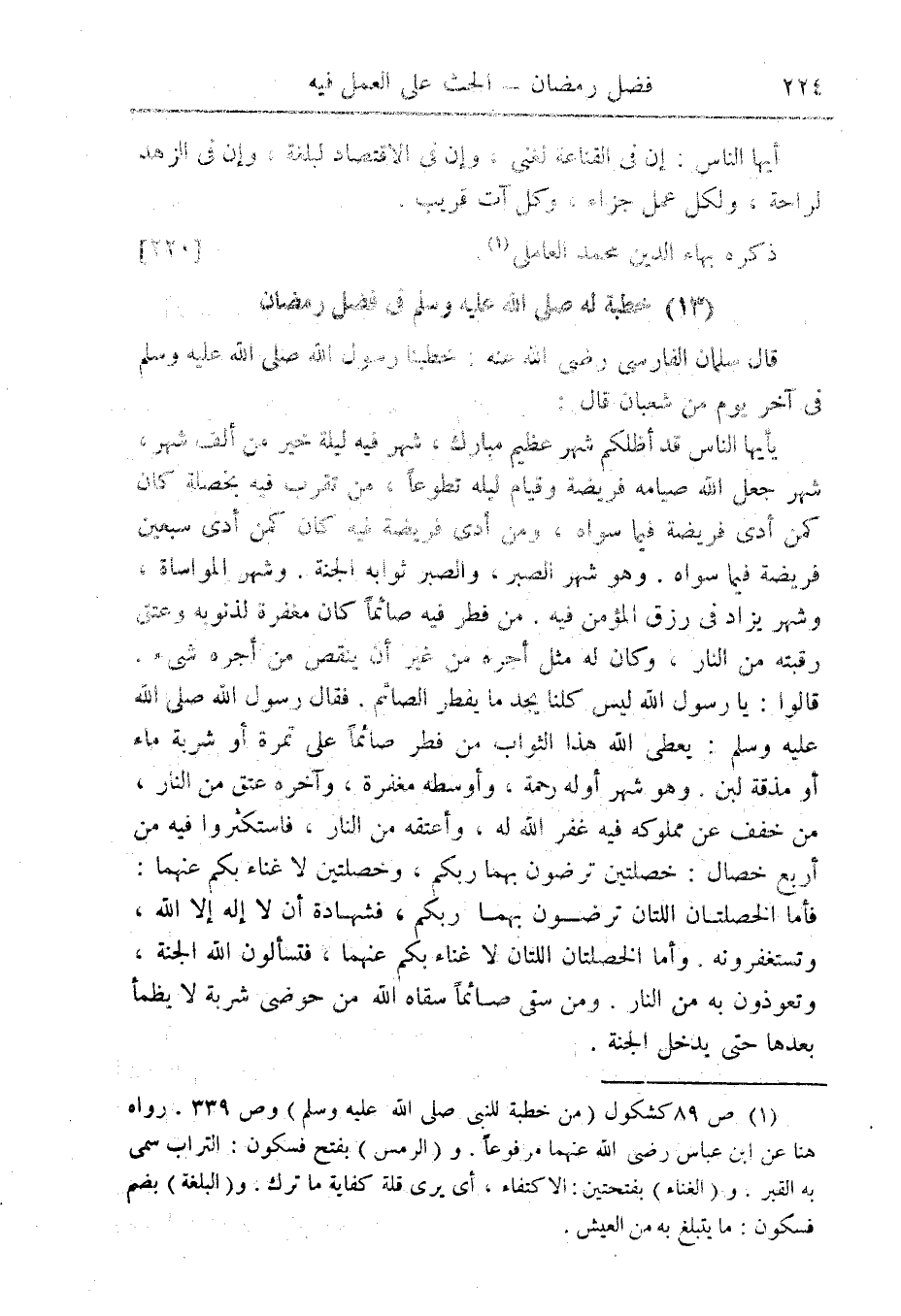 (¬1) ص 89 كشكول (من خطبة للنبى صلى الله عليه ولم) وص 339.رواه هنا عن ابن عباس رضى الله عنهما مرفوعاً. و (الرمس 9 بفتح فسكون: التراب سمى به القبر. و (الغناء) بفتحتين: الاكتفاء، اى يرى قلة كفاية ما ترك. و (البلغة) بضم فسكون: ما يتبع به من العيش ..