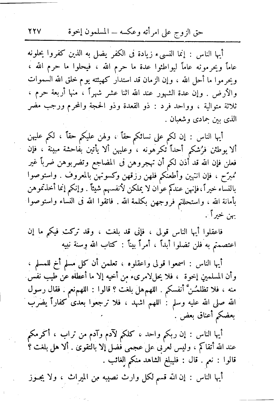 ايها الناس: إن لكم على نسائكم حقاً، ولهن عليكم حقاً، لكم عليهن ألا يوطئن فرُشكم احداً تكرهونه، وعليهن ألا يأتين بفاحشة مبينة، فإن فعلن فإن الله قد أذن لكم أن تهجروهن فى المضاجع وتضربوهن ضرباً غير مُبّرح، فإن انتهين وأطعنكم فلهن رزقهن وكسوتهن بالمعروف. وغاستوصوا بالنساء خير اً، فإنهن عندكم عوان لا يملكن لأنفسهم شيئاً. وإنكم إنما أخذتموهن بأمانة الله، واستحللتم فروجهن بكلمة الله. فاتقوا الله فى النساء واستوصوا بهن خيراً.