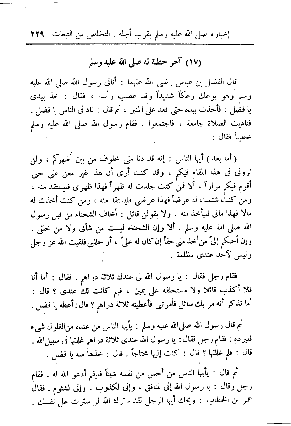 (أما بعد) أيها الناس: إنه قد دنا منى خلوف من بين أظهركم، ولن تروني فى هذا المقام فيكم، وقد كنت أرى أن هذا غير مغن عنى حتى أقوم فيكم مراراً، ألا فمن كنت جلدت له ظهراً فهذا ظهري فليستقد منه، ومن كنت شتمت له عرضاً فهذا عرضي فليستقد منه، ومن كنت أخذت له مالا فهذا مالي فليأخذ منه، ولا يقولن قائل: أخاف الشحناء من قبل رسول الله صلى الله عليه وسلم. ألا وإن الشحناء ليست من شأني ولا من خلقي.