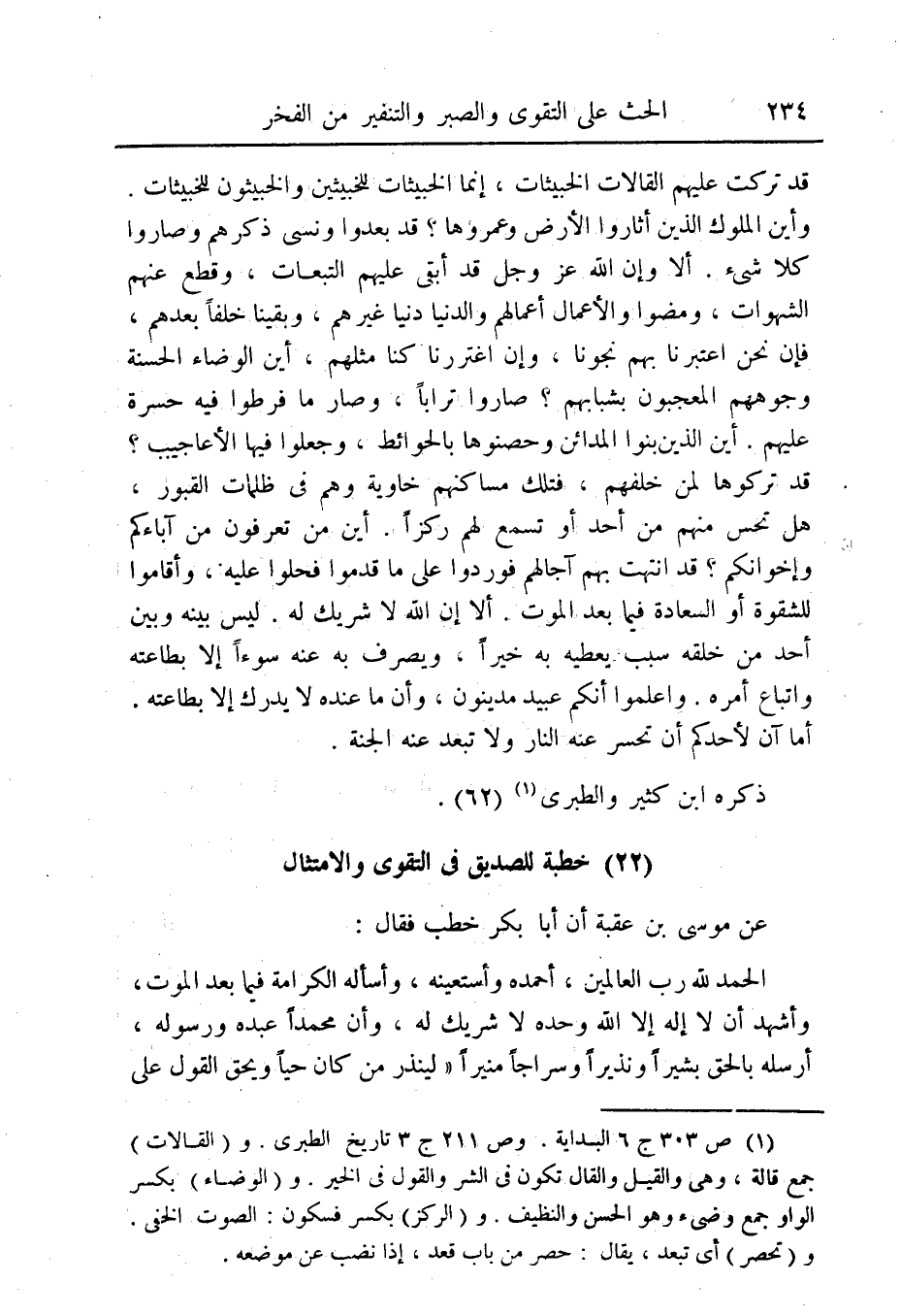 (¬1) ص 303 ج 6 البداية. وص 211 ج 3 تاريخ الطبري. و (القالات) جمع قالة، وهي والقيل والقال تكون في الخير. و (الوضاء) بكسر الواو جمع وضئ وهو الحسن والنظيف. و (الركز) بكسر فسكون: الصوت الخفي. و (تحصر) أي تبعد، يقال: حصر من باب قعد، إذا نضب عن موضعه.