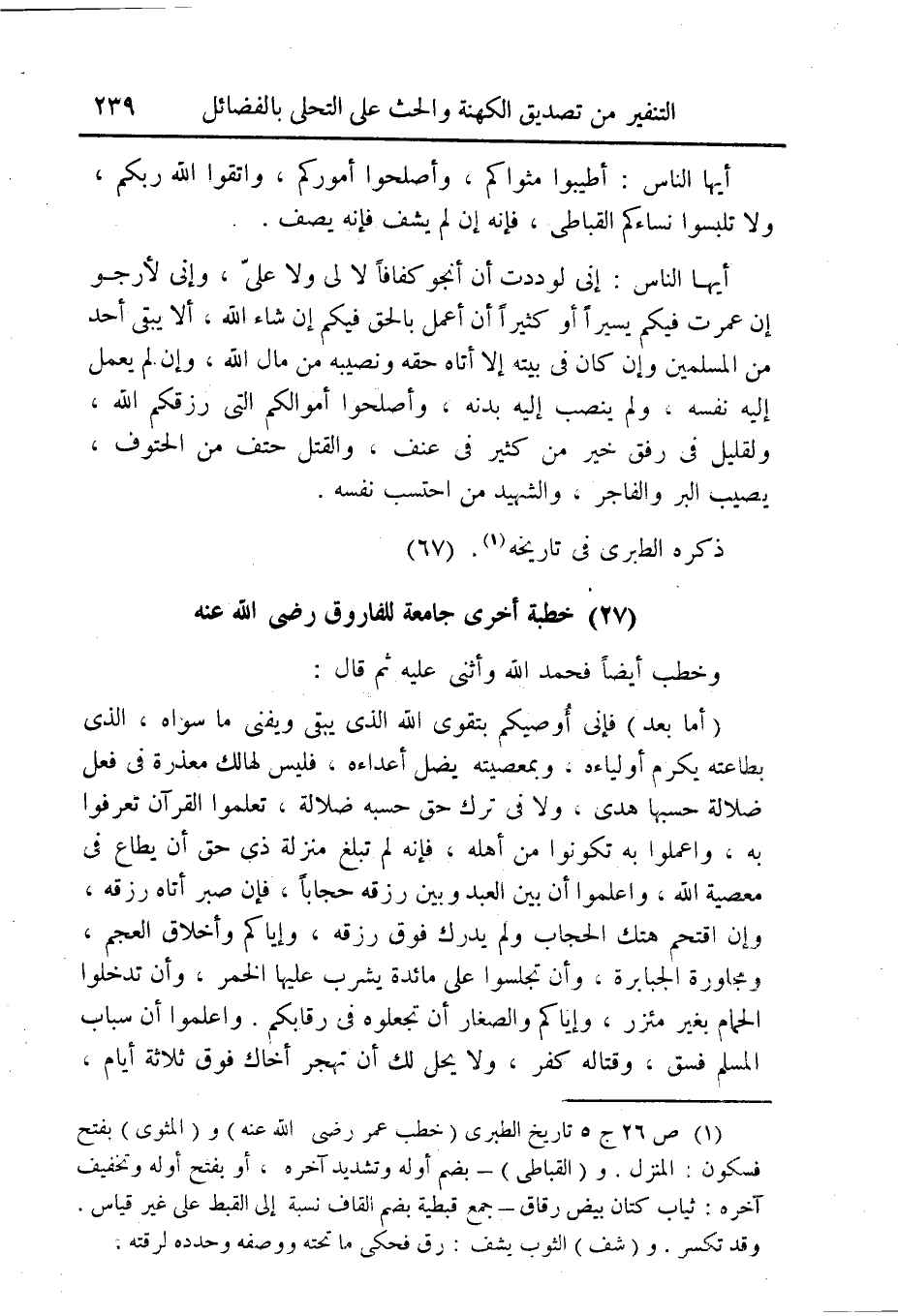(¬1) ص 26 ج 5 تاريخ الطبري (خطب عمر رضي الله عنه) و (المثوى) بفتح فسكون: المنزل. و (القباطي) - بضم أوله وتشديد آخره، أو بفتح أوله وتخفيف آخره: ثياب كتاب بيض رقاق- جمع قبطية بضم القاف نسبة إلى القبط على غير قياس. وقد تكسر. و (شف) الثوب يشف: رق فحكى ما تحته ووصفه وحدده لرقته.