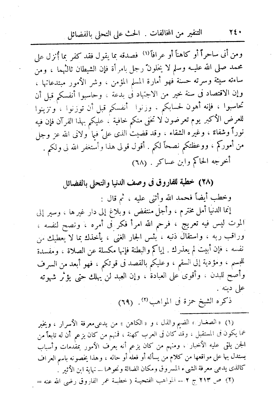(¬2) ص 213 ج 2 - المواهب الفتحية (خطبة عمر الفاروق رضي الله عنه و (منتفض) من الانتفاض وهو ضد الإبرام (والبلاغ) مصدر بلغ الكتاب: وصل و (التعريج) الإقامة و (استقال ذنبه) أي طلب إقالته منه بالتوبة، و (لم يعذرك) من باب ضرب أي لم يقبل اعتذارك (والبطنة) بكسر فسكون: امتلاء البطن من الطعام.