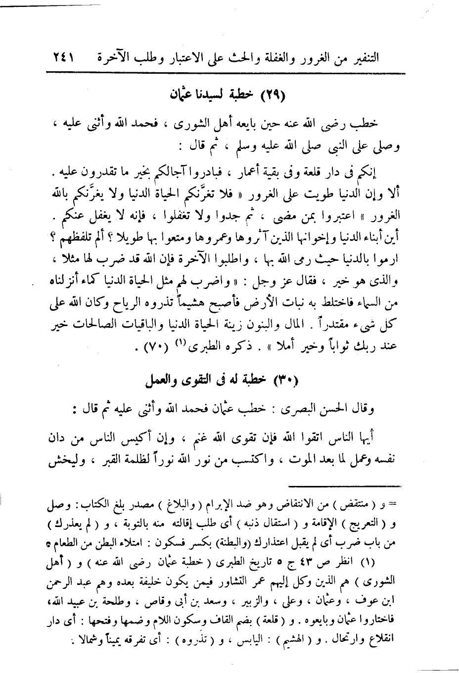 (¬1) انظر ص 43 ج 5 تاريخ الطبري (خطبة عثمان رضي الله عنه) و (أهل الشورى) هم الذين وكل إليهم عمر التشاور فيمن يكون خليفة بعده وهم عبد الرحمن ابن عوف، وعثمان، وعلي، والزبير، وسعد ابن أبي وقاص، وطلحة بن عبيد الله، فاختاروا عثمان وبايعوه. و (قلعة) بضم القاف وسكون اللام وضمها وفتحها: أي دار انقلاع وارتحال. و (الهشيم): اليابس، و (تذروه): أي تفرقه يميناً وشمالاً.