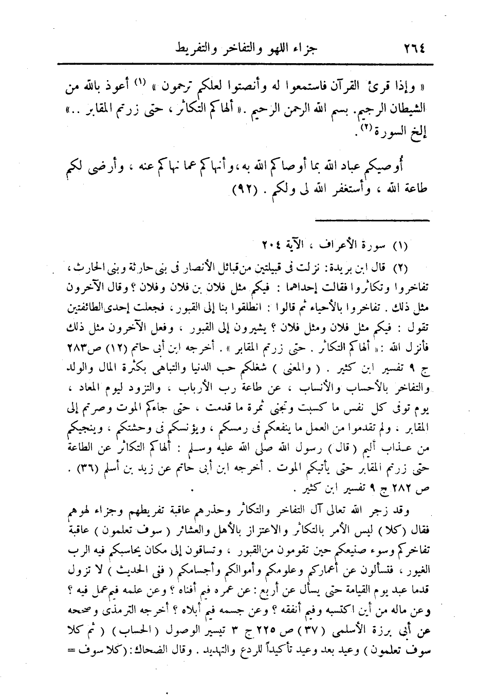 (¬2) قال ابن بريدة: نزلت فى قبيلتين من قبائل الأنصار فى بنى حارثة وبنى الحارث، تفاخروا وتكاثروا فقالت إحداهما: فيكم مثل فلان بن فلان وفلان؟ وقال الآخرون مثل ذلك. تفاخروا بالأحياء ثم قالوا: انطلقوا بنا إلى القبور، فجعلت إحدى الطائفتين تقول: فيكم مثل فلان ومثل فلان؟ يشيرون إلى القبور، وفعل الآخرون مثل ذلك فأنزل الله: " ألهاكم التكاثر. حتى زرتم المقابر ".أخرجه ابن أبى حاتم (12) ص 283 ج 9 تفسير ابن كثير. (والمعنى) شغلكم حب الدنيا والتباهى بكثرة المال والولد والتفاخر بالأحساب والأنساب، عن طاعة رب الأرباب، والتزود ليوم المعاد، يوم توفى كل نفس ما كسبت وتجنى ثمرة ما قدمت، حتى جاءكم الموت وصرتم إلى المقابر، ولم تقدموا من العمل ما ينفعكم فى رمسكم، ويؤنسكم فى وحشتكم، وينجيكم من عذاب أليم (قال) رسول الله صلى الله عليه وسلم: إلهاكم التكاثر عن الطاعة حتى زرتم المقابر حتى يأتيكم الموت. أخرجه ابن أبى حاتم عن زيد بن أسلم (36). ص 282 ج 9 تفسير ابن كثير.