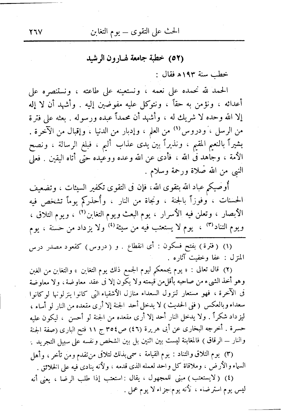 أوصيكم عباد الله بتقوى الله، فإن في التقوى تكفير السيئات، وتضعيف الحسنات، وفوزاً بالجنة، ونجاة من النار، وأُحذركم يوماً تشخيص فيه الأبصار، وتعلن فيه الأسرار، يوم البعث ويوم التغابن (¬2)، ويوم التلاق، ويوم التناد (¬3)، يوم لا يستعتب فيه من سيئة (¬4) ولا يزداد من حسنة، يوم
