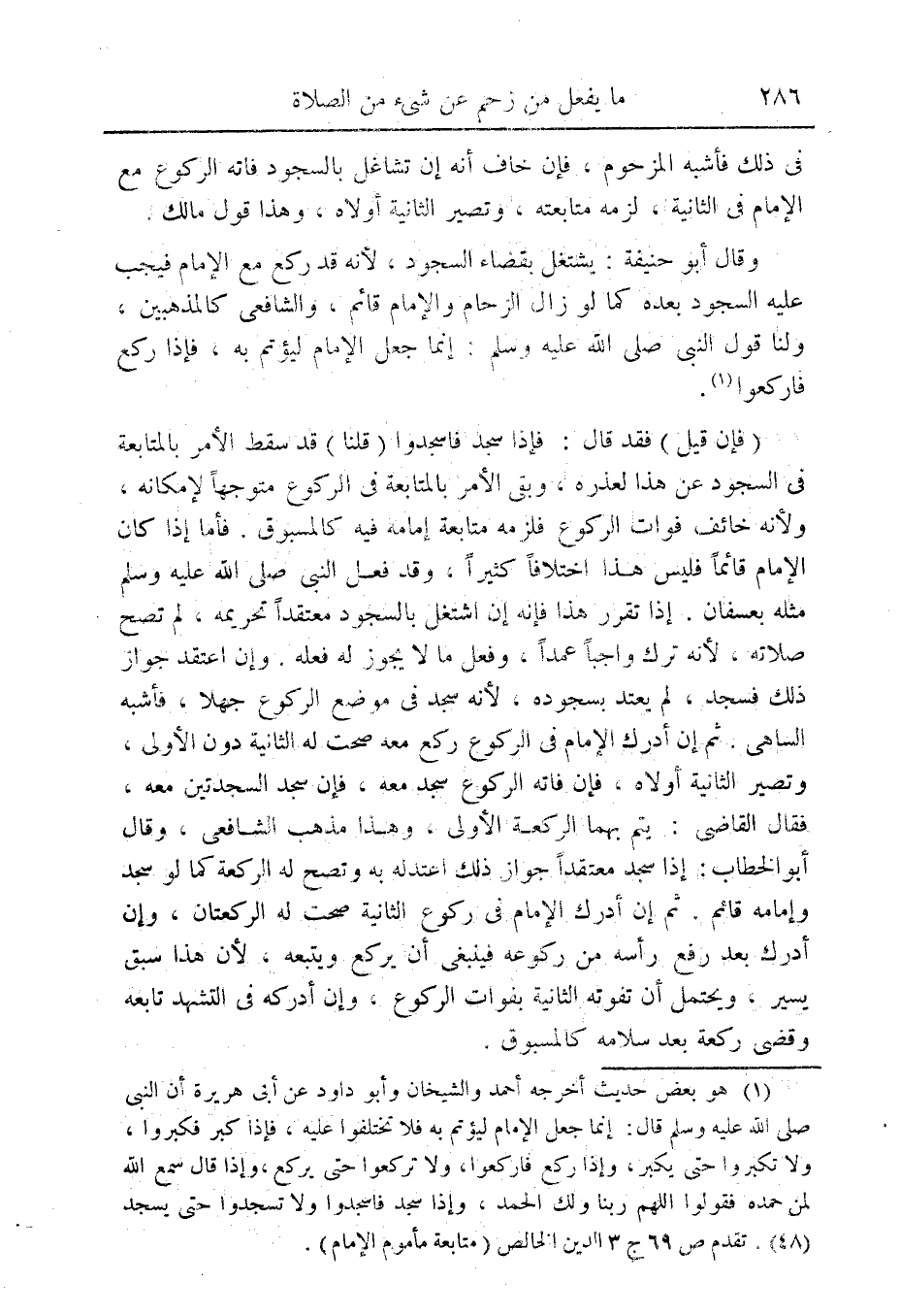 (¬1) هو بعض حديث أخرجه أحمد والشيخان وأبو داود عن أبى هريرة أن النبى صلى الله عليه وسلم قال: إنما جعل الإمام ليؤتم به فلا تختلفوا عليه، فإذا كبر فكبروا ن ولا تكبروا حتى يكبر، وإذا ركع فاركعوا، ولا تركعوا حتى يركع، وإذا قال سمع الله لمن حمده فقولوا اللهم ربنا ولك الحمد، وإذا سجد فاسجدوا ولا تسجدوا حتى يسجد (48). تقدم ص 69 ج 3 الدين الخالص (متابعة مأموم الإمام).