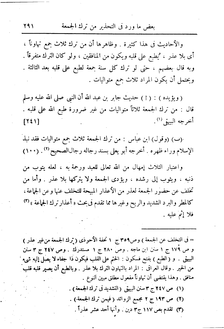 (ويؤيده): (أ) حديث جابر بن عبد الله أن النبى صلى الله عليه وسلم قال: من ترك الجمعة ثلاثاً متواليات من غير ضرورة طبع الله على قلبه.