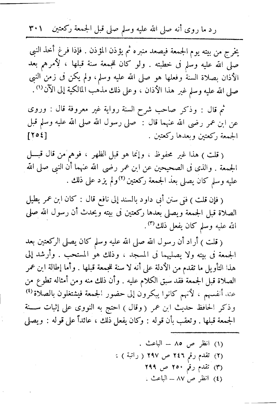 (فإن قلت) ففى سنن أبى داود بالسند إلى نافع قال: كان ابن عمر يطيل الصلاة قبل الجمعة ويصلى بعدها ركعتين فى بيته ويحدث أن رسول الله صلى الله عليه وسلم كان يفعل ذلك (¬3).