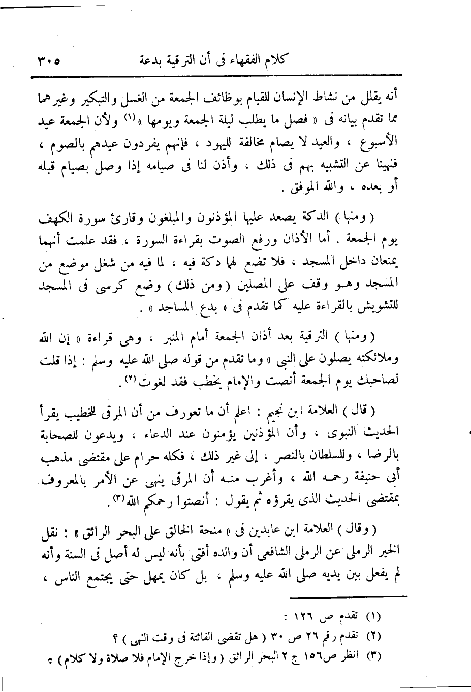(قال) العلامة ابن نجيم: اعلم أن ما تعورف من أن المرقى للخطيب يقرأ الحديث النبوى، وأن المؤذنين يؤمنون عند الدعاء، ويدعون للصحابة بالرضا، وللسلطان بالنصر، إلى غير ذلك، فكله حرام على مقتضى مذهب ابى حنيفة رحمه الله، وأغرب منه أن المرقى ينهى عن الأمر بالمعروف بمقتضى الحديث الذى يقرؤه ثم يقول: أنصتوا رحمكم الله (¬3).