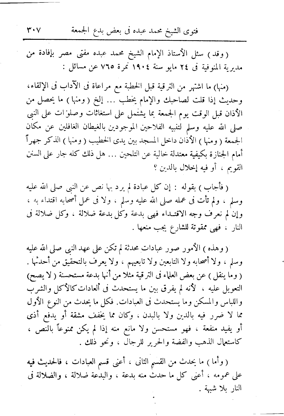 (وقد) سئل الأستاذ الإمام الشيخ محمد عبده مفتى مصر بإفادة من مديرية المنوفية فى 24 مايو سنة 1904 نمرة 765 عن مسائل:
