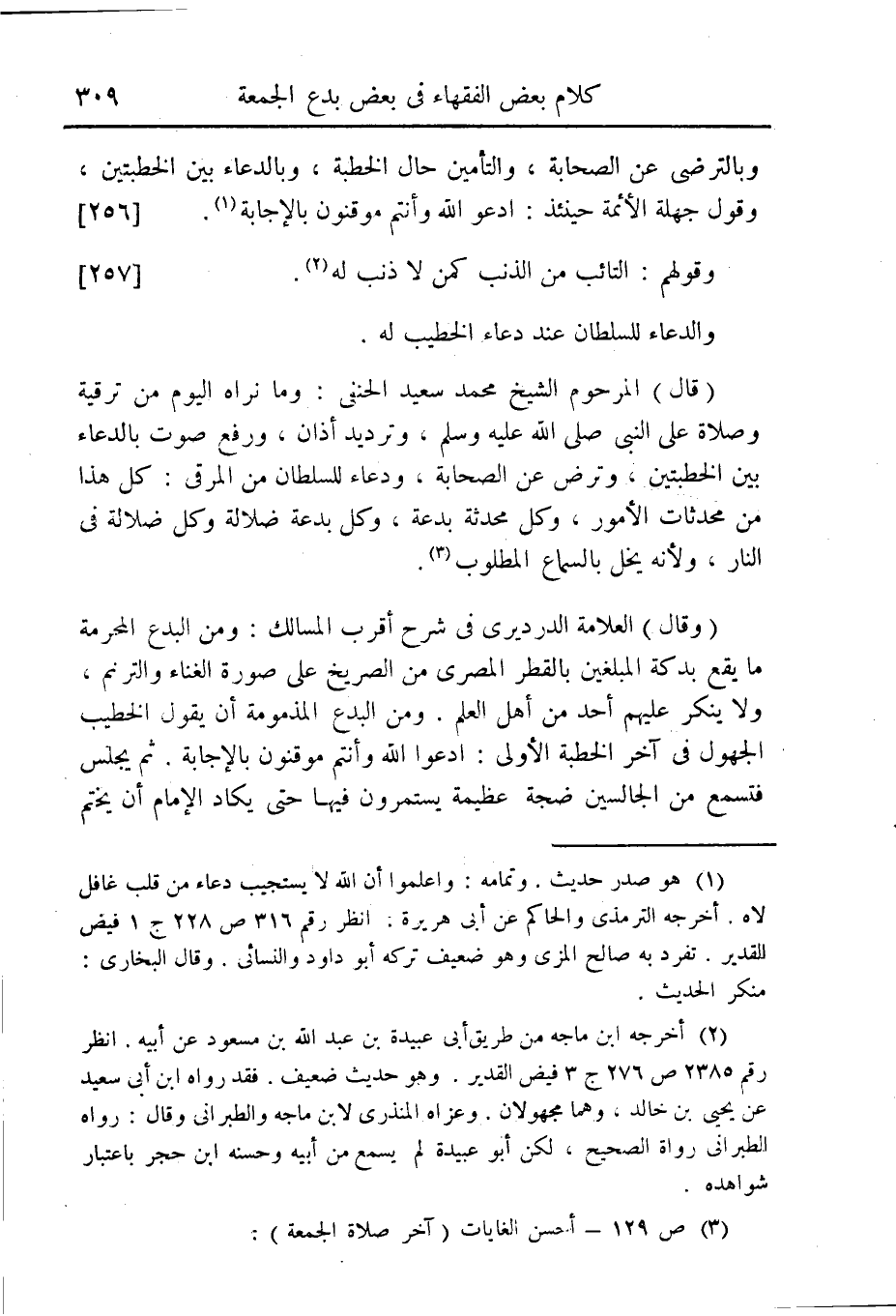(قال) المرحوم الشيخ محمد سعيد الحنفى: وما نراه اليوم من ترقية وصلاة على النبى صلى الله عليه وسلم، وترديد اذان، ورفع صوت بالدعاء بين الخطبتين، وترض عن الصحابة، ودعاء للسلطان من المرقى: كل هذا من محدثات الأمور، وكل محدثة بدعة، وكل بدعة ضلالة وكل ضلالة فى النار، ولأنه يخل بالسماع المطلوب (¬3).