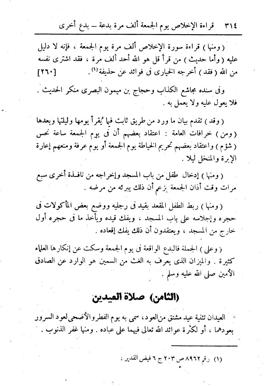 (وعلى) الجملة فالبدع الواقعة فى يوم الجمعة وسكت عن إنكارها العلماء كثيرة. والميزان الذى يعرف به الغث من السمين هو الوارد عن الصادق الأمين صلى الله عليه وسلم.