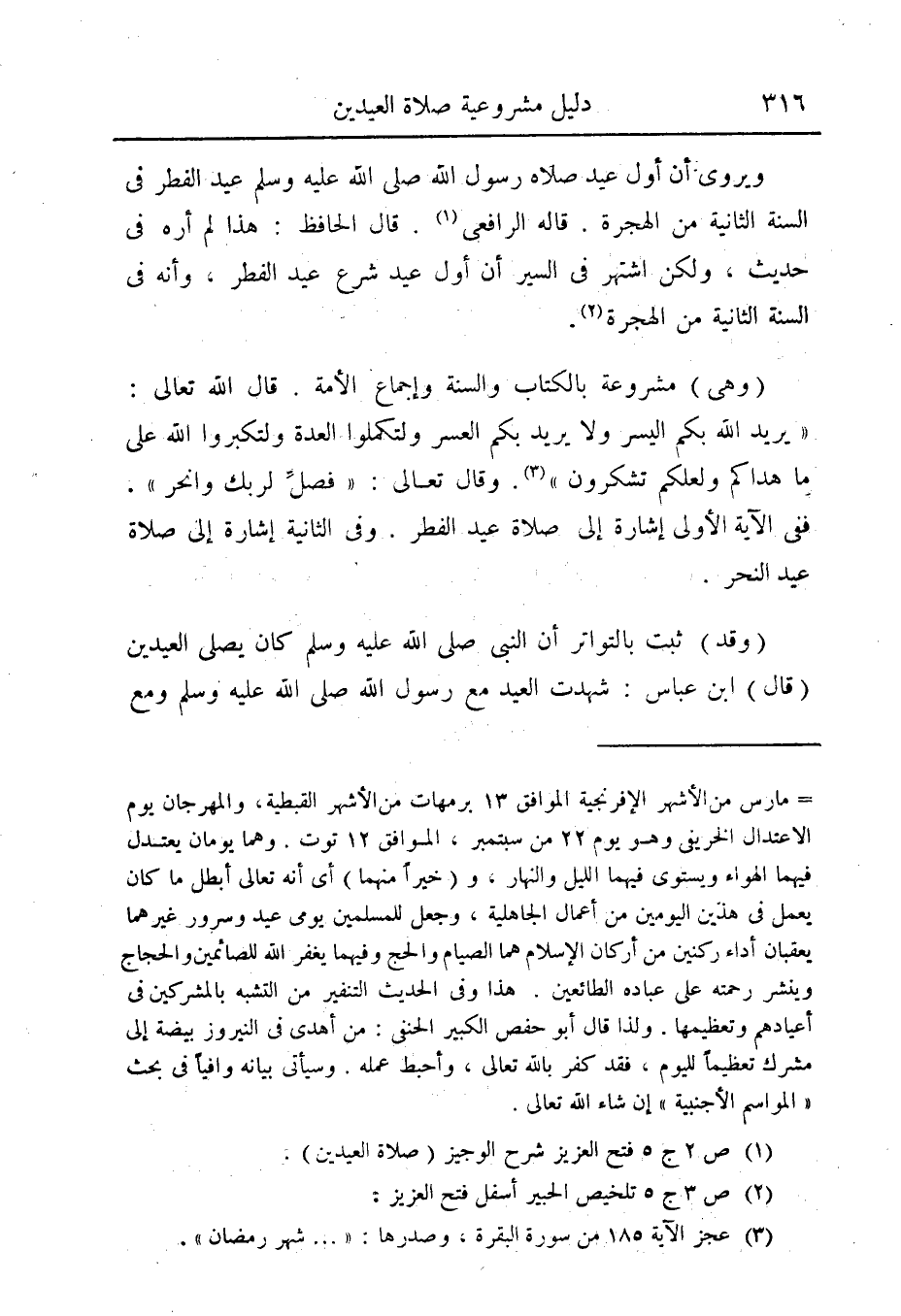 ويروى أن أول عيد صلاة رسول الله صلى الله عليه وسلم عيد الفطر فى السنة الثانية من الهجرة. قاله الرافعى (¬1). قال الحافظ: هذا لم أره فى حديث، ولكن اشتهر فىالسير أن أول عيد شرع عيد الفطر، وأنه فى السنة الثانية من الهجرة (¬2).