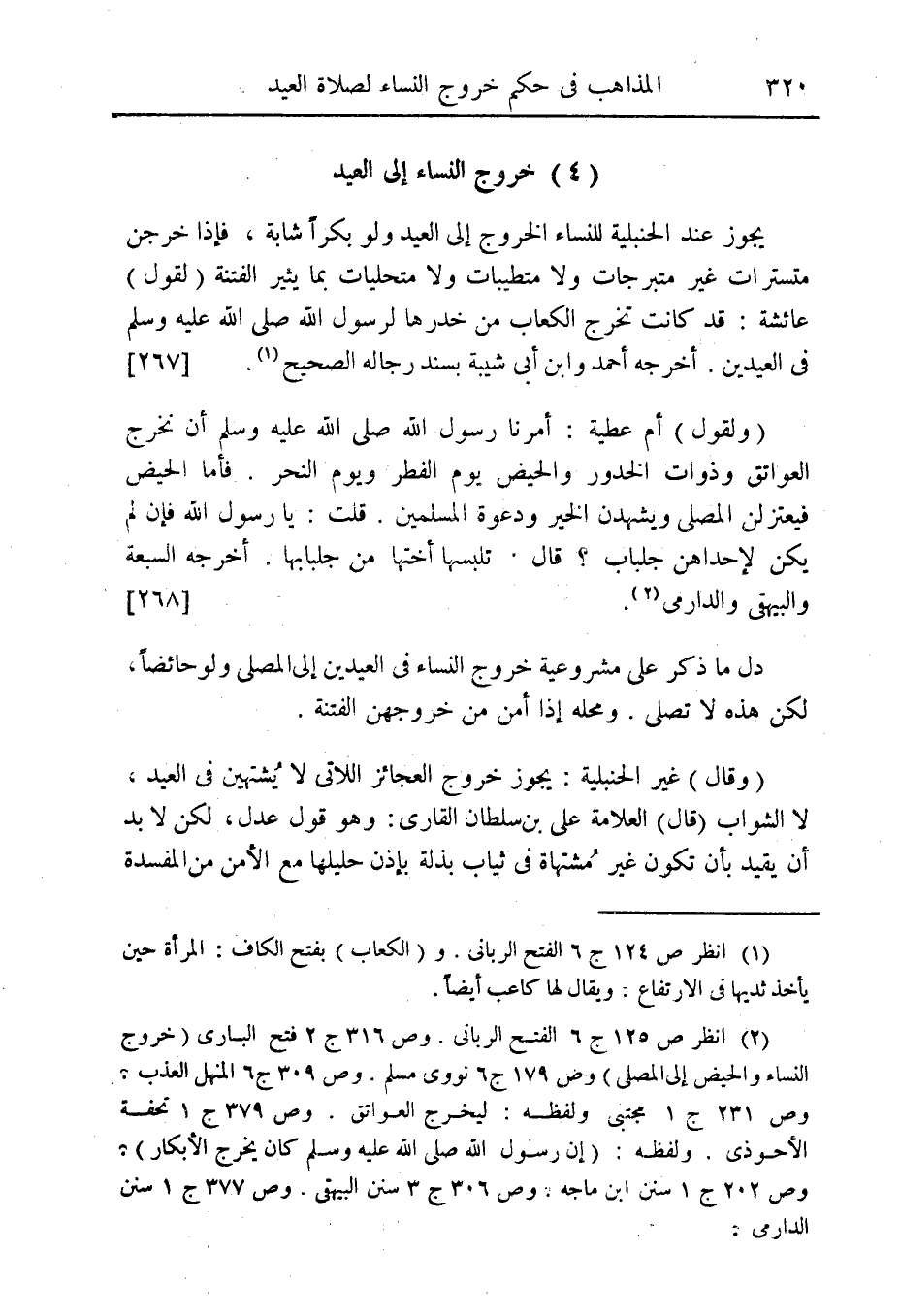 يجوز عند الحنبلية للنساء الخروج إلى العيد ولو بكراً شابة، فإذا خرجن متسترات غير متبرجات ولا متطيبات ولا متحليات بما يثير الفتنة (لقول) عائشة: قد كانت تخرج الكعاب من خدرها لرسول الله صلى الله عليه وسلم فى العيدين. أخرجه أحمد وابن أبى شيبة بسند رجاله الصحيح (¬1). [267].