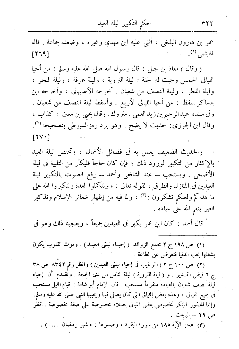 والحديث الضعيف يعمل به فى فضائل الأعمال، وتختص ليلة العيد بالإكثار من التكبير لورود ذلك؛ فإن كان حاجاً فليكثر من التلبية فى ليلة الأضحى. ويستحب- عند الشافعى وأحمد- رفع الصوت بالتكبير ليلة العيدين فى المنازل والطرق، لقوله تعالى: {وَلِتُكْمِلُوا العِدَّةَ وَلِتُكَبِّرُوا اللَّهَ عَلَى مَا هَدَاكُمْ وَلَعَلَّكُمْ تَشْكُرُونَ} (¬3)، ولما فيه من إظهار شعائر الإسلام وتذكير الغير بنعم الله على عباده.