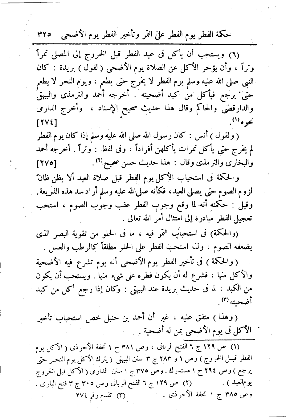 (¬1) ص 129 ج 6 الفتح الربانى، وص 381 ج 1 تحفة الأحوذى (الأكل يوم الفطر قبل الخروج) وص 1 و 283 سنن البيهقى (يترك الأكل يوم النحر حتى يرجع) وص 294 ج 1 مستدرك. وص 375 ج 1 سنن الدارمى (الأكل قبل الخروج يوم العيد).