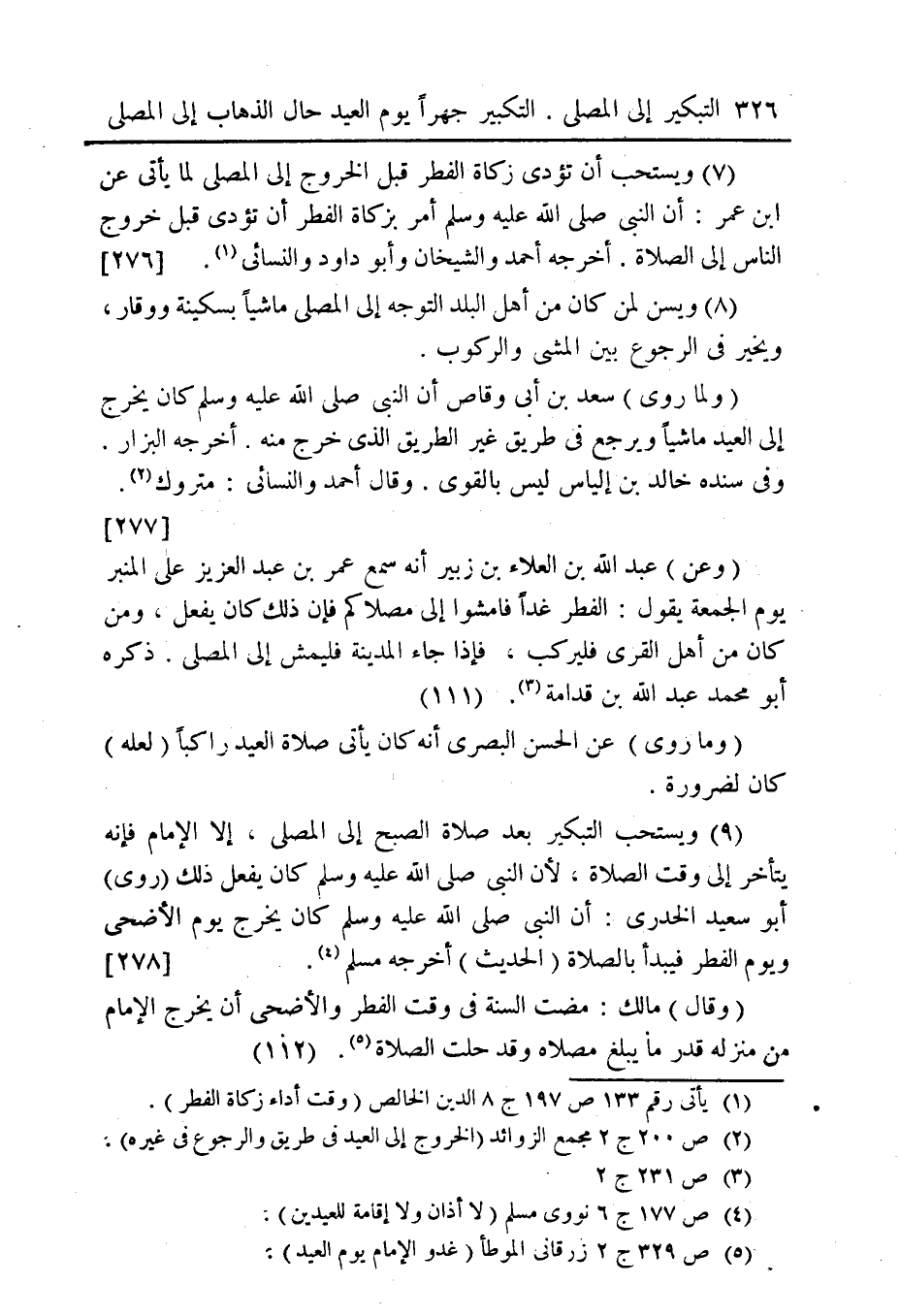 (9) ويستحب التبكير بعد صلاة الصبح إلىالمصلى، إلا الإمام فإنه يتأخر إلى وقت الصلاة، لأن النبى صلى الله عليه وسلم كان يفعل ذلك (روى) أبو سعيد الخدرى: أنالنبى صلى الله عليه وسلم كان يخرج يوم الأضحى ويوم الفطر فيبدأ بالصلاة (الحديث) أخرجه مسلم (¬4). [278].