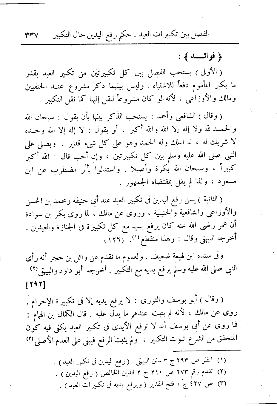 (الثانية) يسن رفع اليدين فى تكبير العيد عند أبى حنيفة ومحمد بن الحسن والأوزاعى والشافعية والحنبلية، وروى عن مالك، لما روى بكر بن سوادة ان عمر رضى الله عنه كان يرفع يديه مع كل تكبيرة فى الجنازة والعيدين. أخرجه البيهقى وقال: وهذا منقطع (¬1). (126).