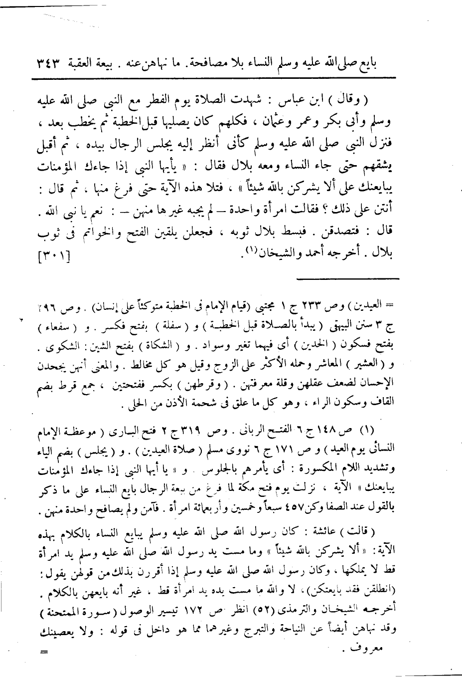 (¬1) ص 148 ج 6 الفتح الربانى. وص 319 ج 2 فتح البارى (موعظة الإمام النسائى يوم العيد) وص 171 ج 6 نووى مسلم (صلاة العيدين). و (يجلس) بضم الياء وتشديد اللام المكسورة: أى يأمرهم بالجلوس. و" يا ايها النبى إذا جاءك المؤمنات يبايعنك " الاية، نزلت يوم فتح مكة لما فرغ من بيعة الرجال بايع النساء على ما ذكر بالقول عند الصفا وكن 457 سبعاً وخمسين وأربعمائة امرأة. فآمن ولم يصافح واحدة منهن.