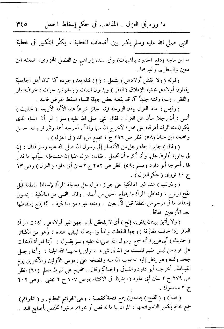 (وليس) منه العزل بإذن الزوجة فإنه جائز شرعاً عند الأئمة الأربعة (لحديث) أنس: أن رجلا سأل عن العزل. فقال النبى صلى الله عليه وسلم: لو أن الماء الذى يكون منه الولد أهرقته على صخرة لخرج الله منها ولداً. اخرجه أحمد والبزار بسند حسن وصححه ابن حبان (58) انظر ص 2296 ج 4 مجمع الزوائد (فى العزل).