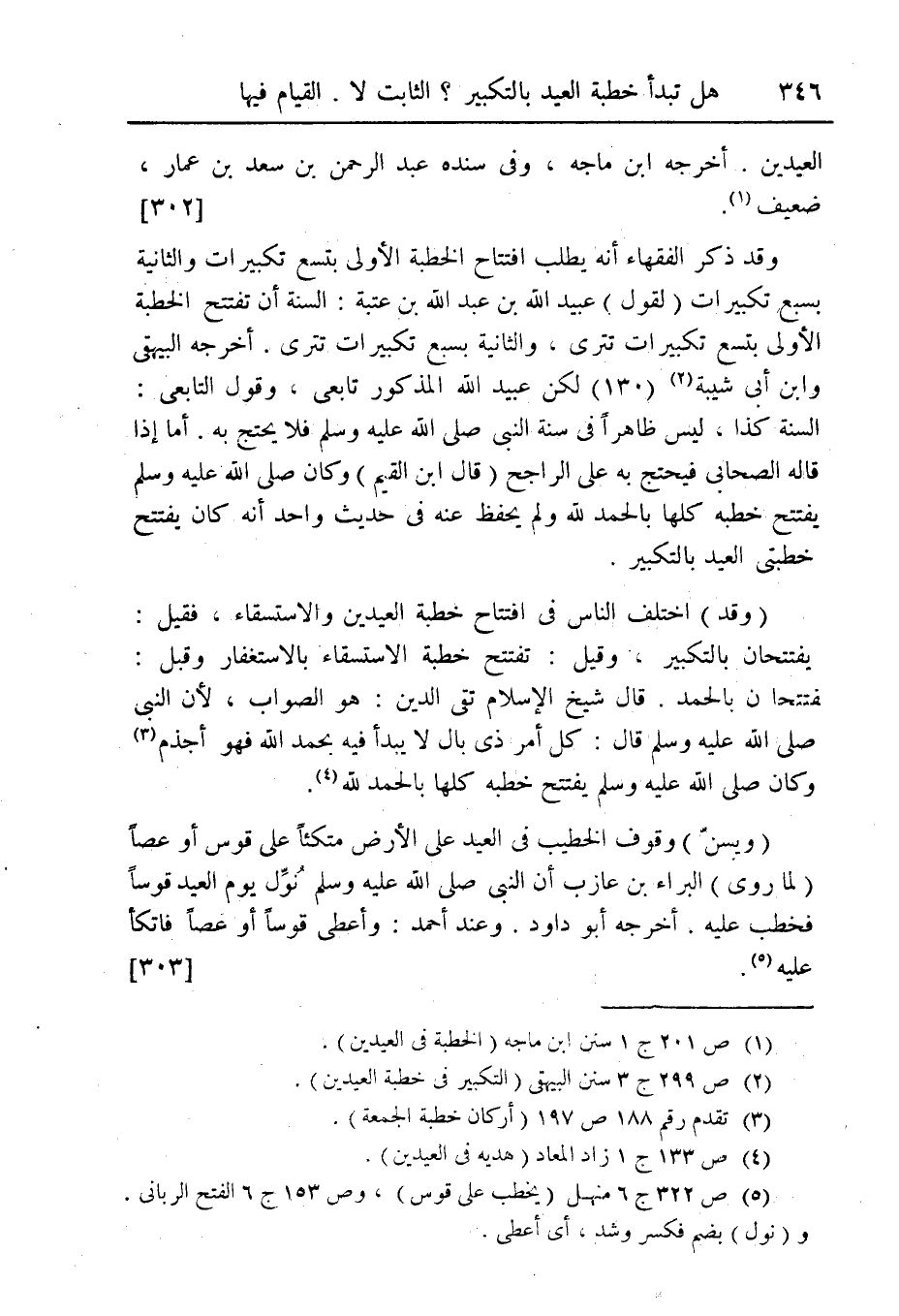 وقد ذكر الفقهاء أنه يطلب افتتاح الخطبة الأولى بتسع تكبيرات والثانية بسبع تكبيرات (لقول) عبيد الله بن عبد الله بن عتبة: السنة أن تفتتح الخطبة الأولى بتسع تكبيرات تترى، والثانية بسبع تكبيرات تترى. أخرجه البيهقى وابن ابى شيبة (¬2) (130) لكن عبيد الله المذكور تابعى، وقول التابعى: السنة كذا، ليس ظاهراً فى سنة النبى صلى الله عليه وسلم فلا يحتج به. أما إذا قاله الصحابى فيحتج به على الراجح (قال ابن القيم) وكان النبىصلى الله عليه وسلم يفتتح خطبه كلها بالحمد لله ولم يحفظ عنه فى حديث واحد أنه كان يفتتح خطبتى العيد بالتكبير.