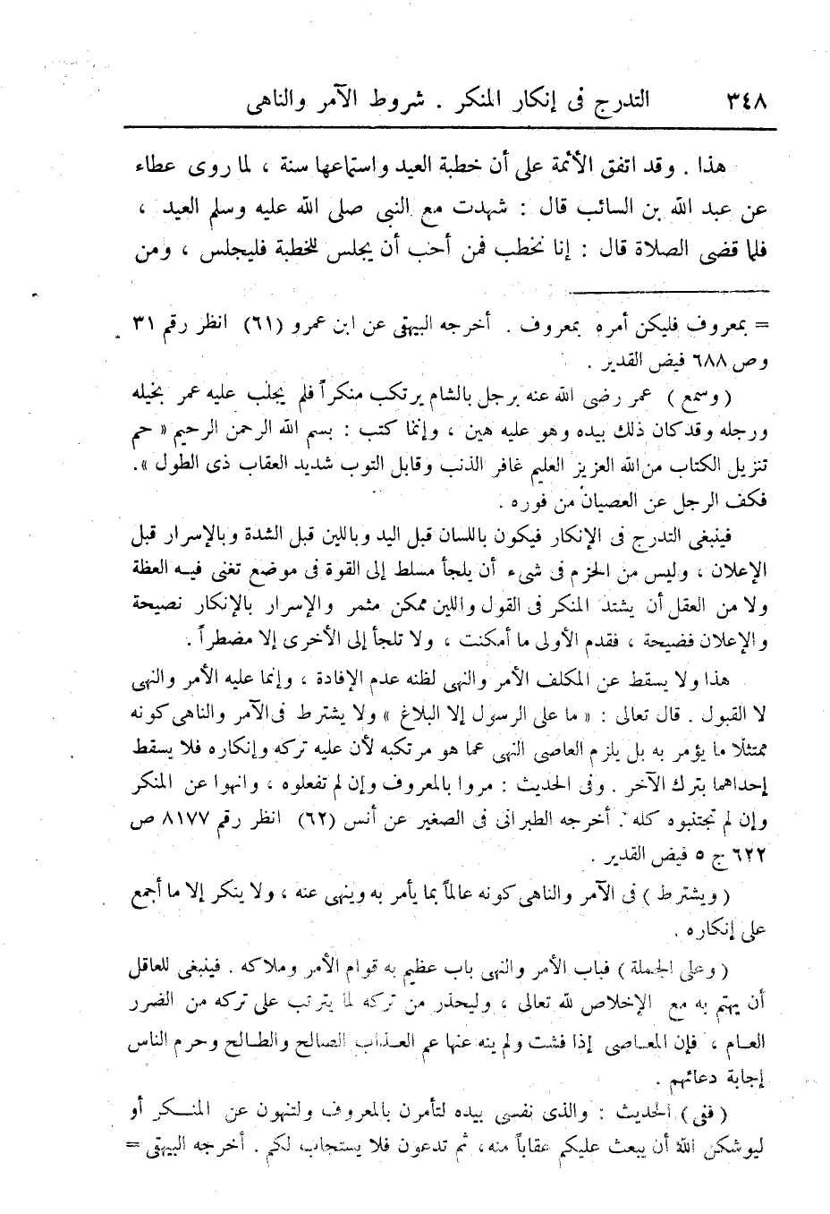هذا ولا يسقط عن المكلف الأمر والنهى لظنه عدم الإفادة، وإنما عليه الأمر والنهى لا القبول. قال تعالى: " ما على الرسول إلا البلاغ " ولا يشترط فى الأمر والناهى كونه ممتثلا ما يؤمر به بل يلزم العاصى النهى عما هو مرتكبه لأن عليه تركه وإنكاره فلا يسقط إحداهما بترك الآخر. وفى الحديث: مروا بالمعروف وإن لم تفعلوه، وانهوا عن المنكر وإن لم تجتنبوه كله. أخرجه الطبرانى فى الصغير عن أنس (62) انظر رقم 8177 ص 622 ج 5 فيض القدير.