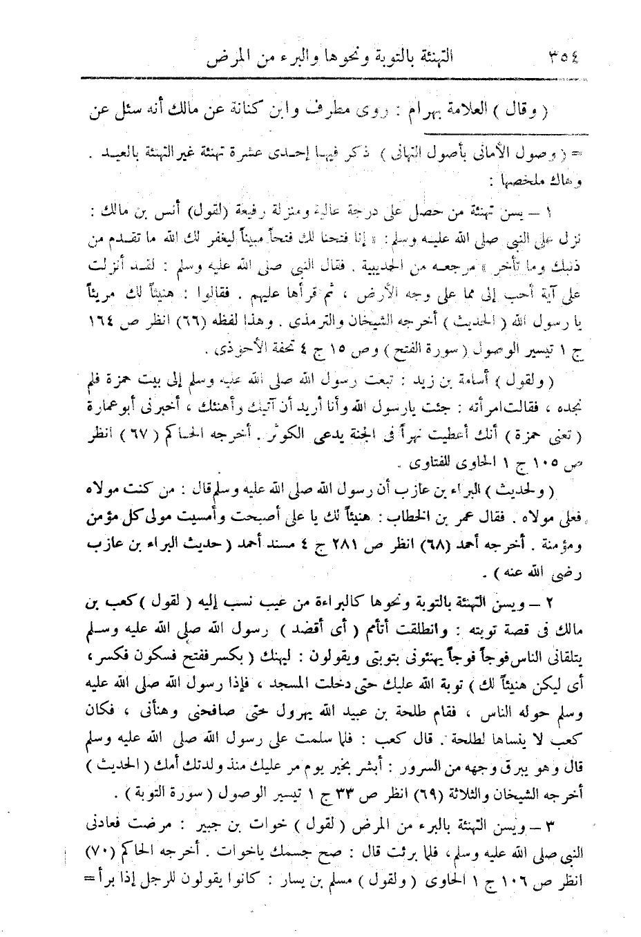 2 - ويسن التهنئة بالتوبة ونحوها كالراءة من عيب نسب إليه (لقول) كعب بن مالك فى قصة توبته: وانطلقت أتأت (أى أقصد) رسول الله صلى الله عليه وسلم يتلقانى الناس فوجاً فوجاً يهنئونى قبتوبتى ويقولون: ليهنك (بكسر ففتح فسكون فكسر، أى ليكن هنيئاً لك) توبة الله عليك حتى دخلت المسجد، فإذا رسول الله صلىالله عليه وسلم حوله الناس، فقام طلحة بن عبيد الله يهرول حتى صافحنى هنأنى، فكان كعب لا ينساها لطلحة. قال كعب: فلما سلمت علىرسول الله صلى الله عليه وسلم قال وهو يبرق وجهه من السرور: أبشر بخير يوم مر عليك منذ ولدتك أمك (الحديث) أخرجه الشيخان والثلاثة (69) انظر ص 33 ج 1 تيسير الوصول (سورة التوبة).
