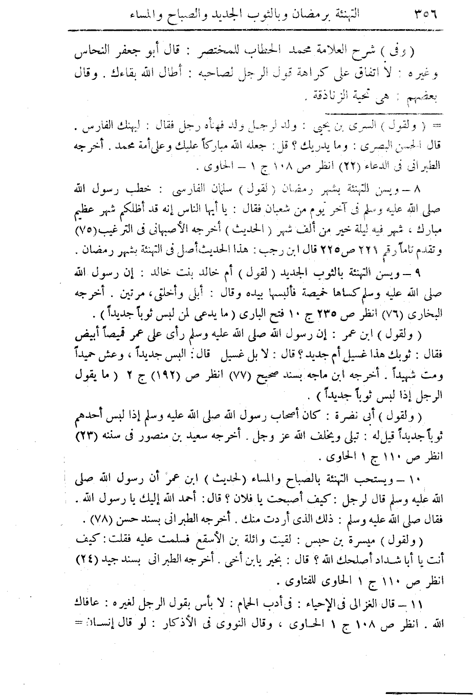 9 - ويسن التهنئة بالثوب الجديد (لقول) ام خالد بنت خالد: إن رسول الله صلى اللهعليه وسلم كساها خميصة فألبسها بيده وقال: أبلى وأخلقى، مرتين. أخرجه البخارى (76) انظر ص 235 ج 10 فتح البارى (ما يدعى لمن لبس ثوباً جديداً).