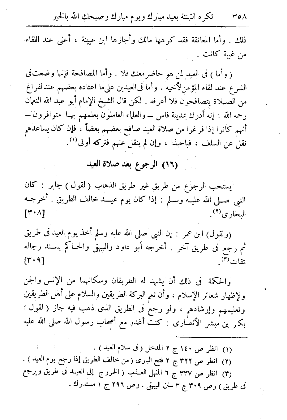 يستحب الرجوع من طريق غير طريق الذهاب (لقول) جابر: كان النبى صلى الله عليه وسلم: إذا كان يوم عيد خالف الطريق. اخرجه البخارى (¬2). [308].
