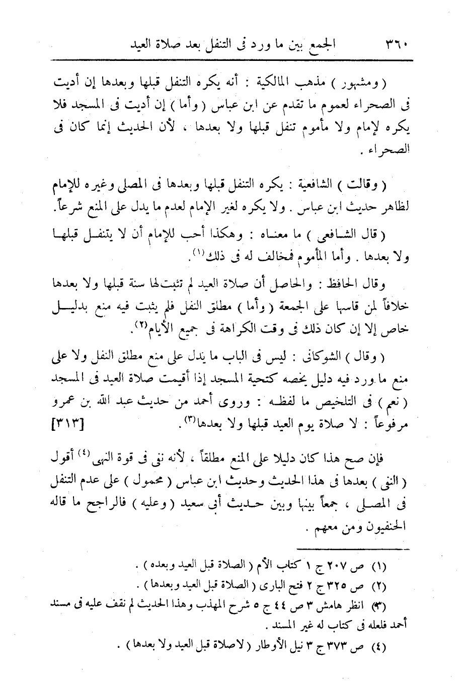 (وقال) (الشوكانى كط ليس فى الباب ما يدل على منع مطلق النفل ولا على منع ما ورد فيه دليل يخصه كتحية المسجد إذا أقيمت صلاة العيد فى المسجد 0 نعم) فى التلخيص ما لفظه: وروى أحمد من حديث عبد الله بن عمرو مرفوعاً: لا صلاة يوم العيد قبلها ولا بعدها (¬3). [313].