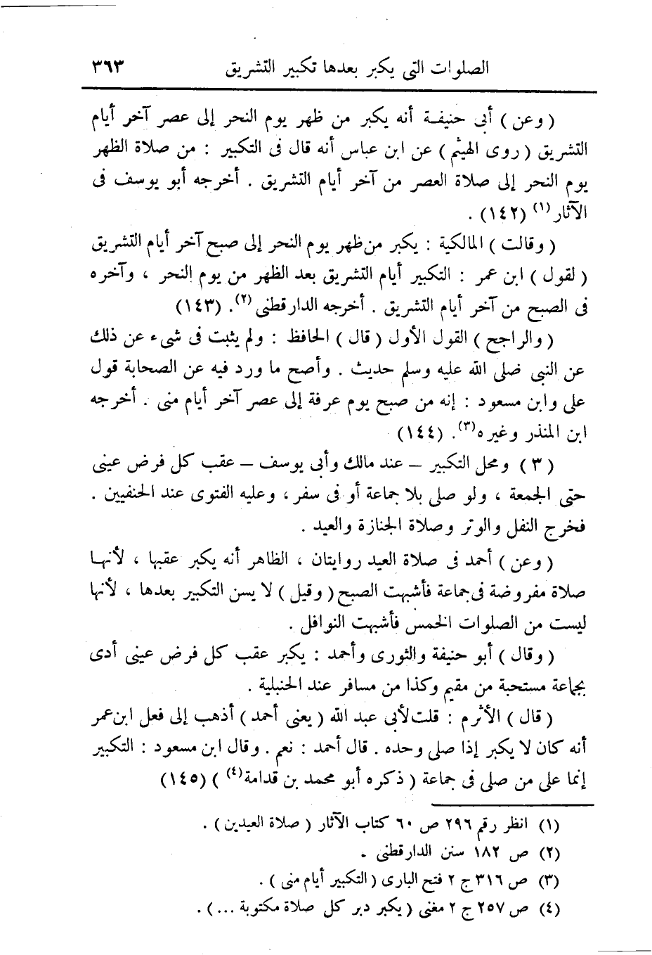 (وقالت) المالكية: يكبر من ظهر يوم النحر إلى صبح آخر ايام التشريق (لقول) ابن عمر: التكبير أيام التشريق بعد الظهر من يوم النحر، وآخره فى الصبح من آخر أيام التشريق. أخرجه الدارقطنى (¬2). (143).