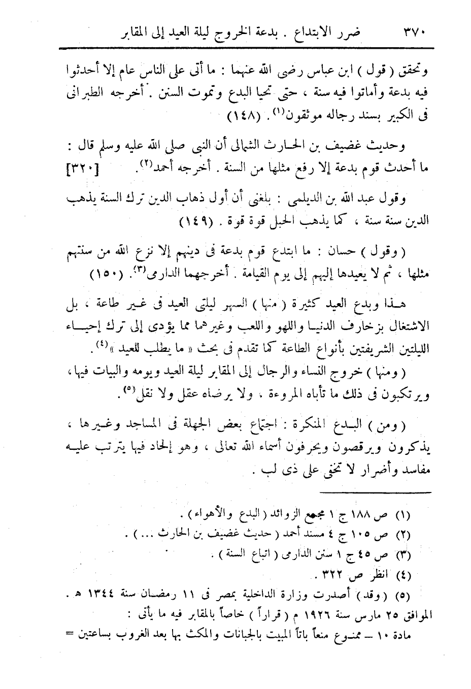 (ومنها) خروج النساء والرجال إلى المقابر ليلة العيد ويومه والبيات فيها، ويرتكبون فى ذلك ما تأباه المروءة. ولا يرضاه عقل ولا نقل (¬5).
