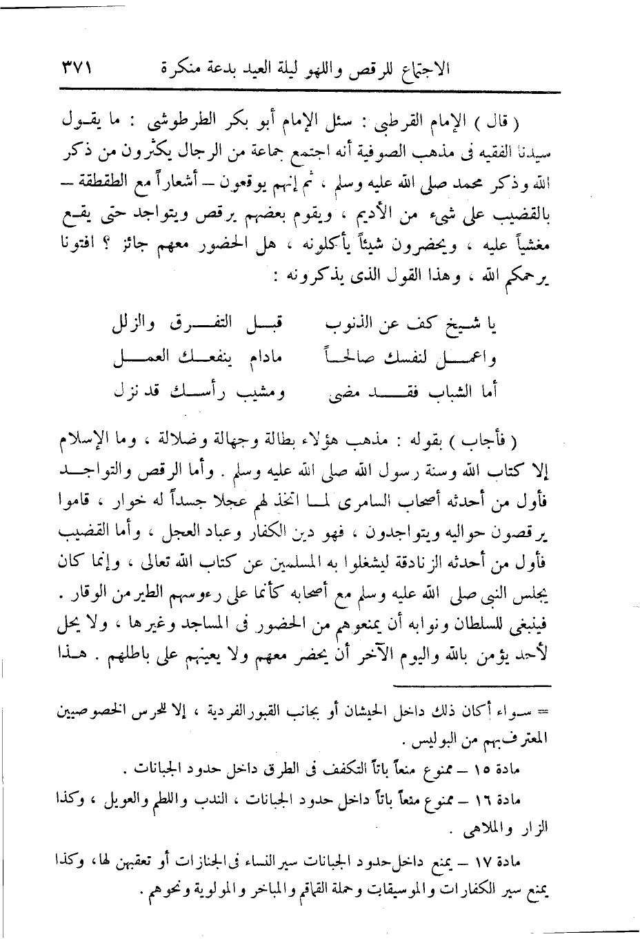(قال) الإمام القرطبى: سئل الإمام أبو بكر الطرطوشى: ما يقول سيدنا الفقيه فى مذهب الصوفية أنه اجتمع جماعة من الرجال يكثرون من ذكر الله وذكر محمد صلى الله عليه وسلم، ثم إنهم يوقعون - أشعاراً مع الطقطقة - بالقضيب على شئ من الأديم، ويقوم بعضهم يرقص ويتواجد حتى يقع مغشياً عليه، ويحضرون شيئاً يأكلونه، هل الحضور معهم جائز؟ افتونا يرحمكم الله، وهذا القول الذى يذكرونه: