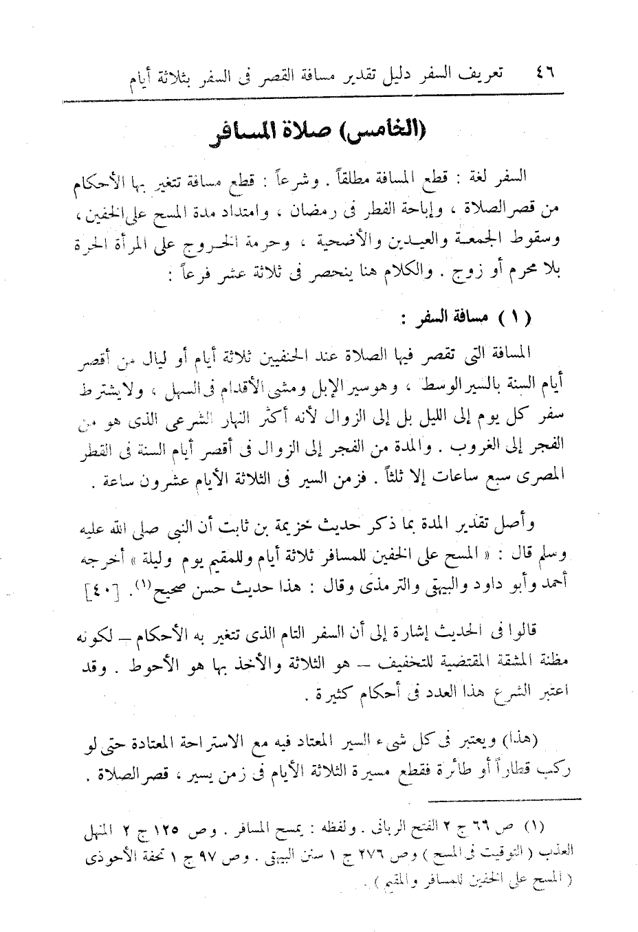 السفر لغة: قطع المسافة مطلقاً. وشرعاً: قطع مسافة تتغير بها الأحكام من قصر الصلاة، وإباحة الفطر فى رمضان، وامتداد مدة المسح على الخفين، وسقوط الجمعة والعيدين والأضحية، وحرمة الخروج على المرأة الحرة بلا محرم أو زوج. والكلام هنا ينحصر فى ثلاثة عشر فرعاً: