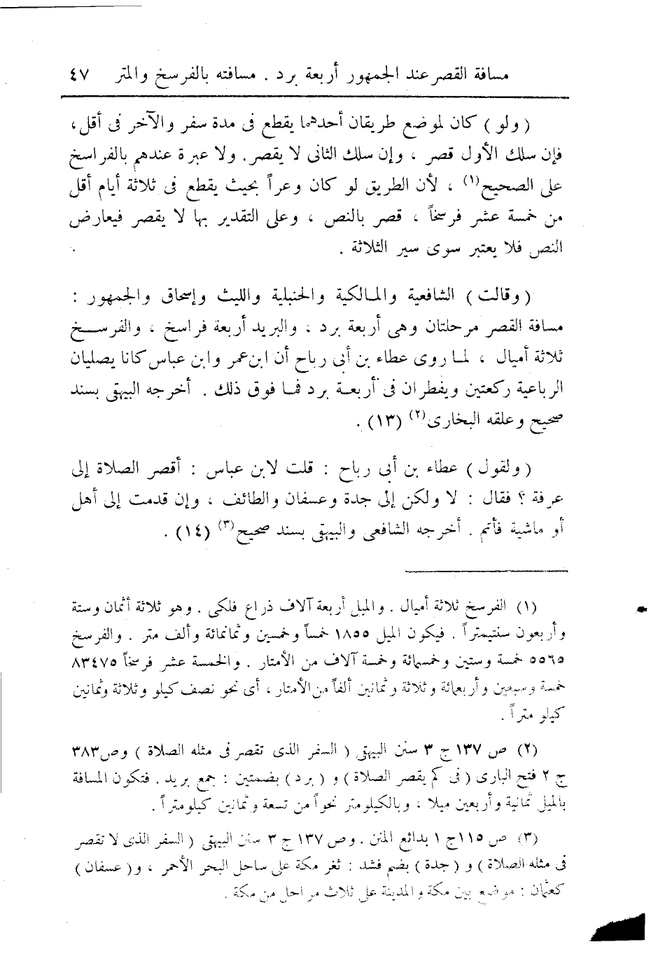 (¬2) ص 137 ج 3 سنن البيهقى (السفر الذى تقص 2 ر فى مثله الصلاة) وص 383 ج 2 فتح البارى (فى كم يقصر الصلاة) و (برد) بضمتين: جمع بريد. فتكون المسافة بالميل ثمانية وأربعين ميلا، وبالكيلو متر نحواً من تسعة وثمانين كيلو متراً.