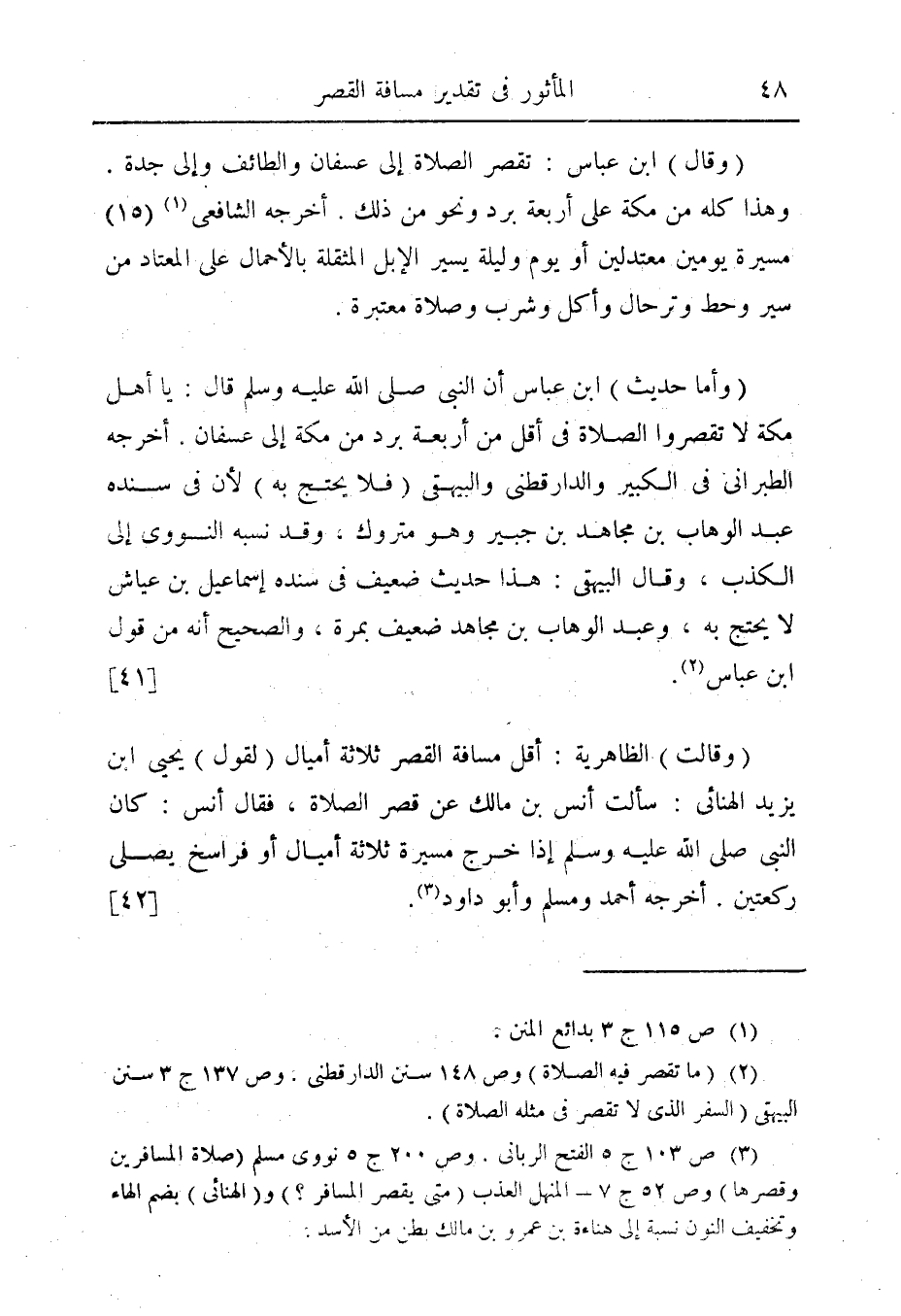 (¬2) (ما تقصر فيه الصلاة) وص 148 سنن الدارقطنى. وص 137 ج 3 سنن البيهقى (السفر الذى لا تقصر فى مثله الصلاة).