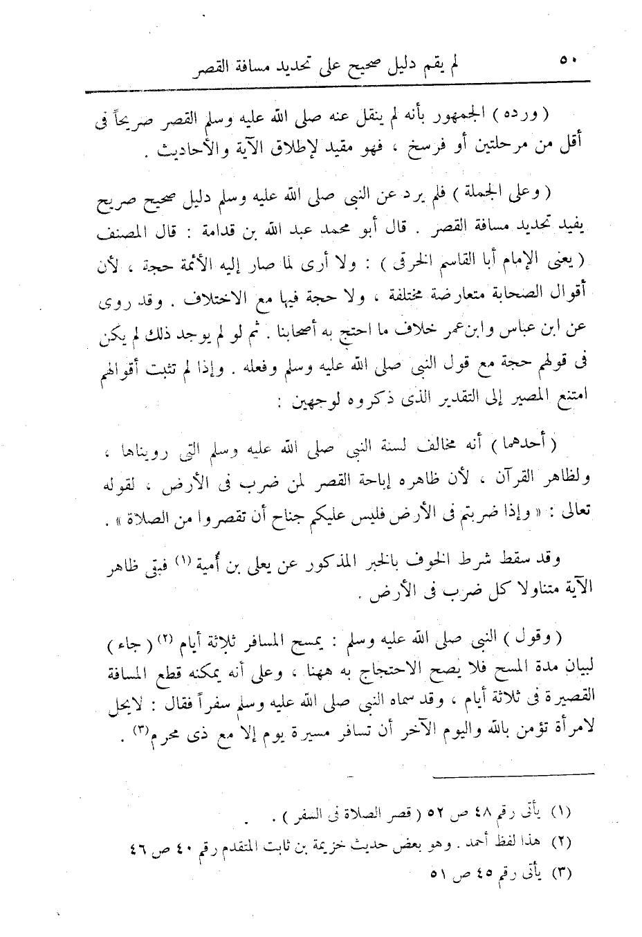 (وعلى الجملة) فلم يرد عن النبى صلى الله عليه وسلم دليل صحيح صريح يفيد تحديد مسافة القصر. قال أبو محمد عبد الله بن قدامة: قال المصنف (يعنى الإمام أبا القاسم الخرقى): ولا أرى لما صار إليه الأئمة حجة، لأن أقوال الصحابة متعارضة مختلفة، ولا حجة فيها مع الاختلاف. وقد روى عن ابن عباس وابن عمر خلاف ما احتج به أصحابنا. ثم لو لم يوجد ذلك لم يكن فى قولهم حجة مع قول النبي صلى الله عليه وسلم وفعله. وإذا لم تثبت أقوالهم امتنع المصير إلى التقدير الذى ذكروه لوجهين:
