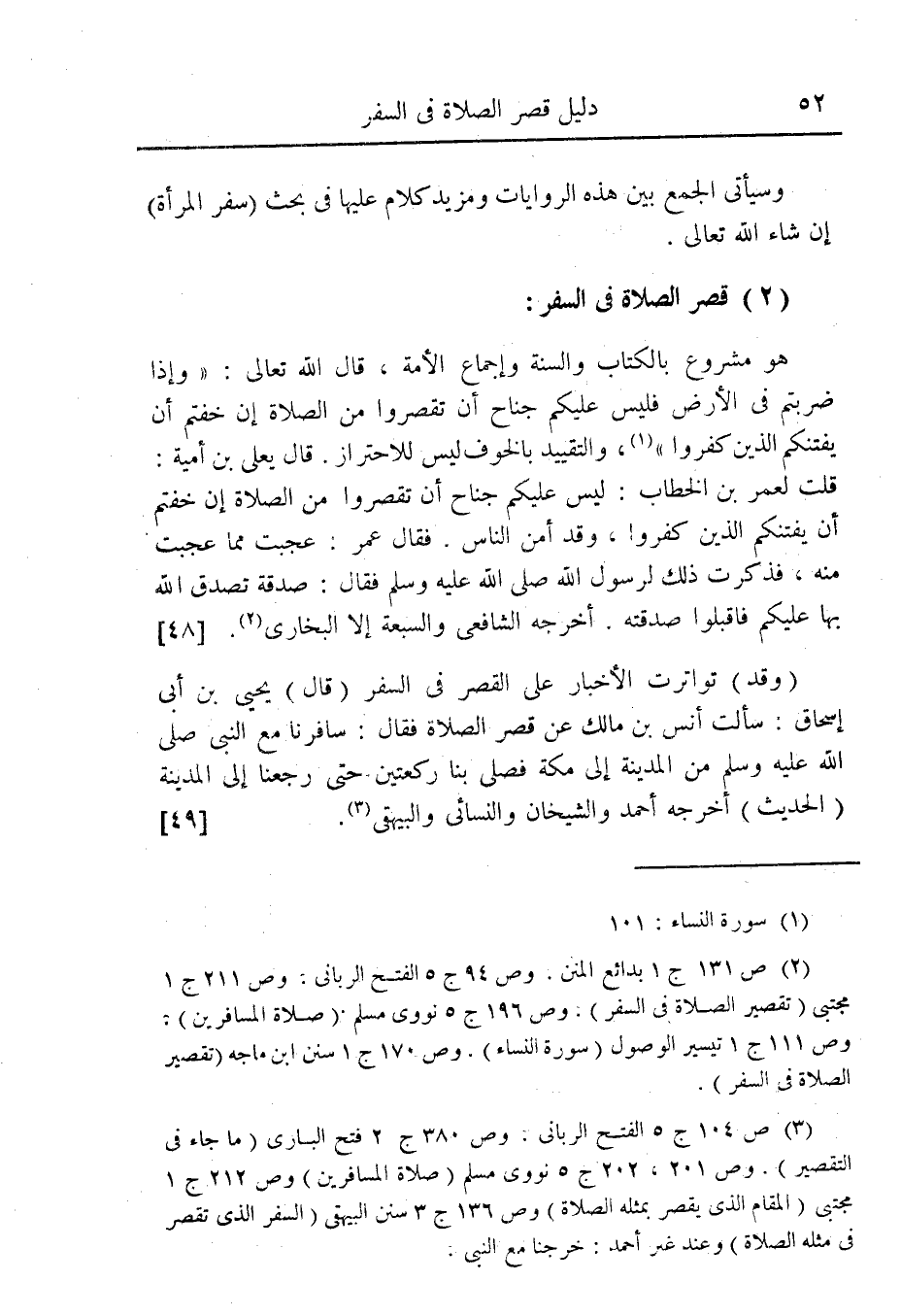 (وقد) تواترت الأخبار على القصر فى السفر (قال) يحيى بن أبى إسحاق: سألت أنس بن مالك عن قصر الصلاة فقال: سافرنا مع النبى صلى الله عليه وسلم من المدينة إلى مكة فصلى بنا ركعتين حتى رجعنا إلى المدينة (الحديث) أخرجه أحمد والشيخان والنسائى والبيهقى (¬3). [49].