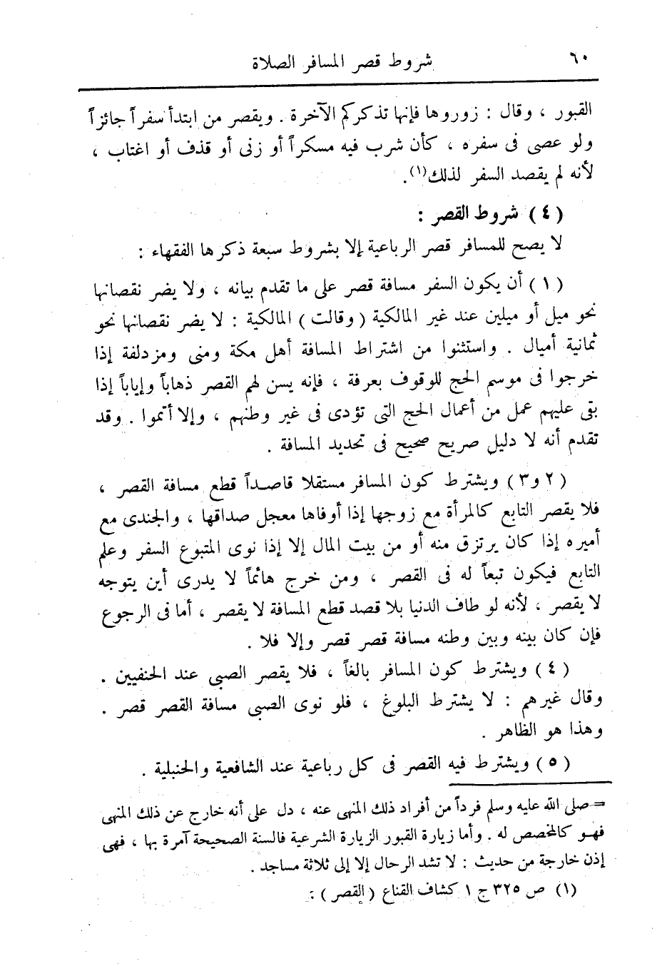 (1) أن يكون السفر مسافة قصر على ما تقدم بيانه، ولا يضر نقصانها نحو ميل أو ميلين عند غير المالكية (وقالت): لا يضر نقصانها نحو ثمانية أميال. واستثنوا من اشتراط المسافة اهل مكة ومنى ومزدلفة إذا خرجوا فى موسم الحج للوقوف بعرفة، فإنه يسن لهم القصر ذهاباً وإياباً إذا بقى عليهم عمل من أعمال الحج التى تؤدى فى غير وطنهم، وإلا أتموا. وقد تقدم أنه لا دليل صريح صحيح فى تحديد المسافة.