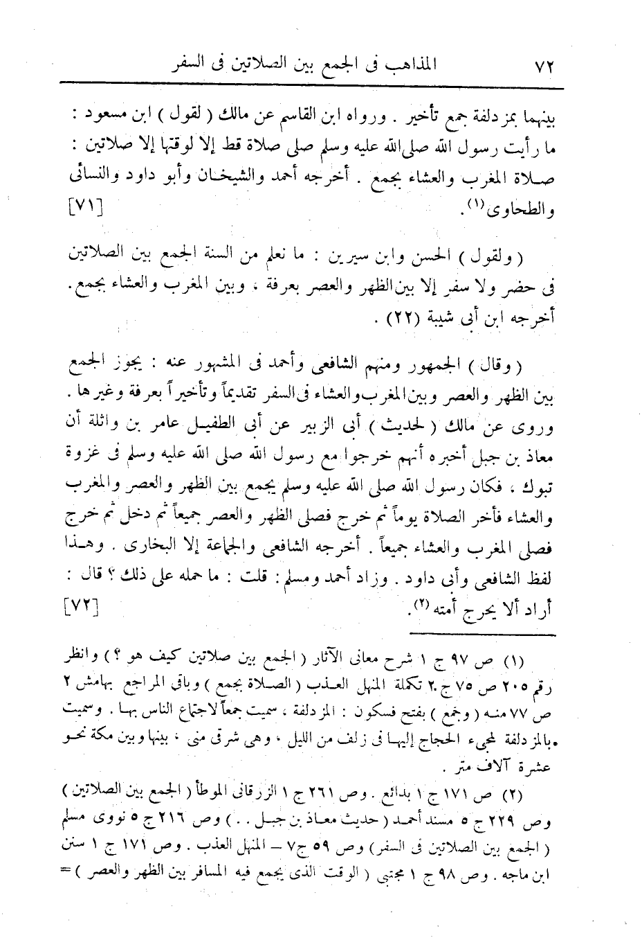 (¬2) ص 171 ج 1 بدائع. وص 261 ج 1 الزرقانى الموطأ (الجمع بين الصلاتين) وص 229 ج 5 مسند أحمد (حديث معاذ بن جبل .. ) وص 216 ج 5 نووى مسلم (الجمع بين الصلاتين فى السفر) وص 59 ج 7 - المنهل العذب. وص 171 ج 1 سنن ابن ماجه. وص 98 ج 1 مجتبى (الوقت الذى يجمع فيه المسافر بين الظهر والعصر وص 387 ج 1 تحفة الأحوذى. و (أراد ألا يحرج أمته) أى لأن فى السفر مشقة، فإذا كلف المسافر أداء كل صلاة فى وقتها كان فى ذلك حرج زيادة على مشقة السفر فشرع الجمع تخفيفاً ودفعاً للحرج.