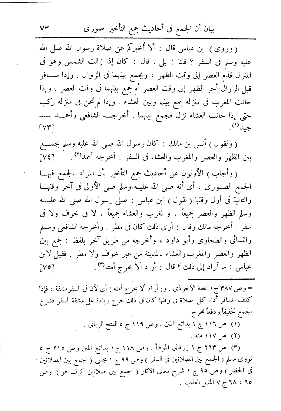 (¬3) ص 263 ج 1 زرقانى الموطأ. وص 118 ج 1 بدائع المنن وص 215 ج 5 نووى مسلم (الجمع بين الصلاتين فى السفر) وص 99 ج 1 مجتبى (الجمع بين الصلاتين فى الحضر) وص 95 ج 1 شرح معانى الآثار (الجمع بين صلاتين كيف هو) وص 65، 68 ج 7 المنهل العذب.