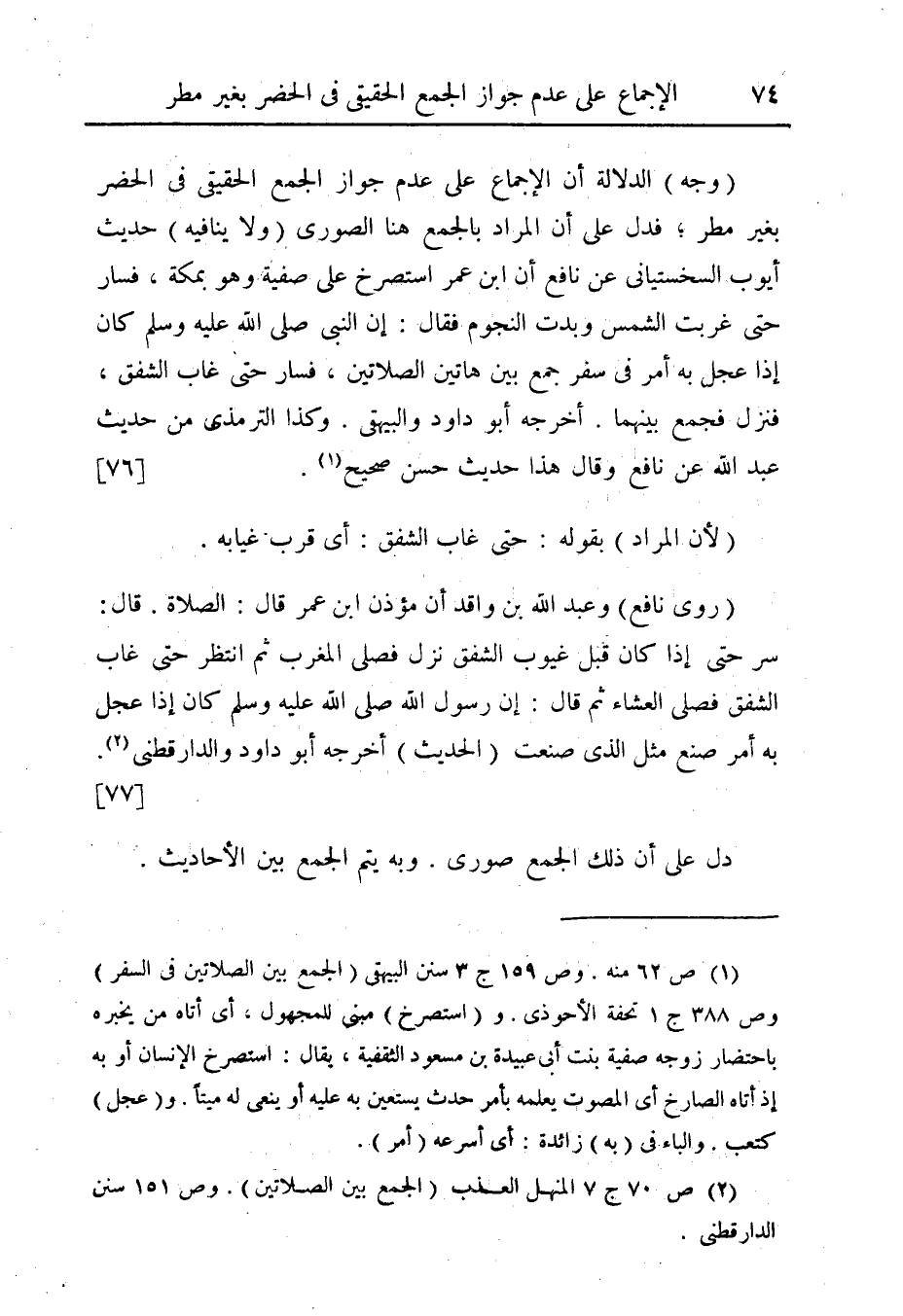 (وجه) الدلالة أن الإجماع على عدم جواز الجمع الحقيقى فى الحضر بغير مطر؛ فدل على أن المراد بالجمع هنا الصورى (ولا ينافيه) حديث أيوب السخستيانى عن نافع أن ابن عمر استصرخ على صفية وهو بمكة، فسار حتى غربت الشمس ووبدت النجوم فقال: إنالنبى صلى الله عليهوسلم كان إذا عجل به أمر فى سفر جمع بين هاتين الصلاتين، فسار حتى غاب الشفق، فنزل فجمع بينهما. أخرجه أبو داود والبيهقى. وكذا الترمذى من حديث عبد الله عن نافع وقال هذا حديث حسن صحيح (¬1). [76].