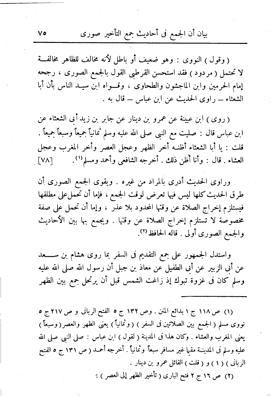 (¬1) ص 118 ج 1 بدائع المنن. وص 132 ج 5 الفتح الربانى وص 217 ج 5 نووى مسلم (الجمع بين الصلاتين فى السفر) (وثامنياً) يعنى الظهر والعصر (وسبعاً) يعنى المغرب والعشاء. وكان هذا فى المدينة (لقول) ابن عباس: صلى الله عليه وسلم فى المدينة مقيما غير مسافر سبعاً وثمانياً. أخرجه أحمد (ص 131 ج 5 الفتح الربانى) (1) و (قلت) القائل عمرو بن دينار.