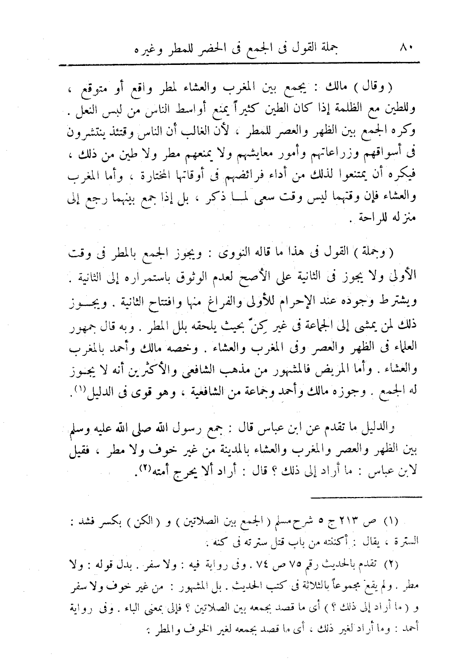 (¬2) تقدم بالحديث رقم 75 ص 74. وفى رواية فيه: ولا سفر. بدل قوله: ولا مطر. ولم يقع مجموعاً بالثلاثة فى كتب الحديث. بل المشهور: من غير خوف ولا سفر و (ما أراد إلى ذلك؟ ) أى ما قصد بجمعه بين الصلاتين؟ فإلى بمعنى الباء. وفى رواية أحمد: وما أراد لغير ذلك، أى ما قصد بجمعه لغير الخوف والمطر.
